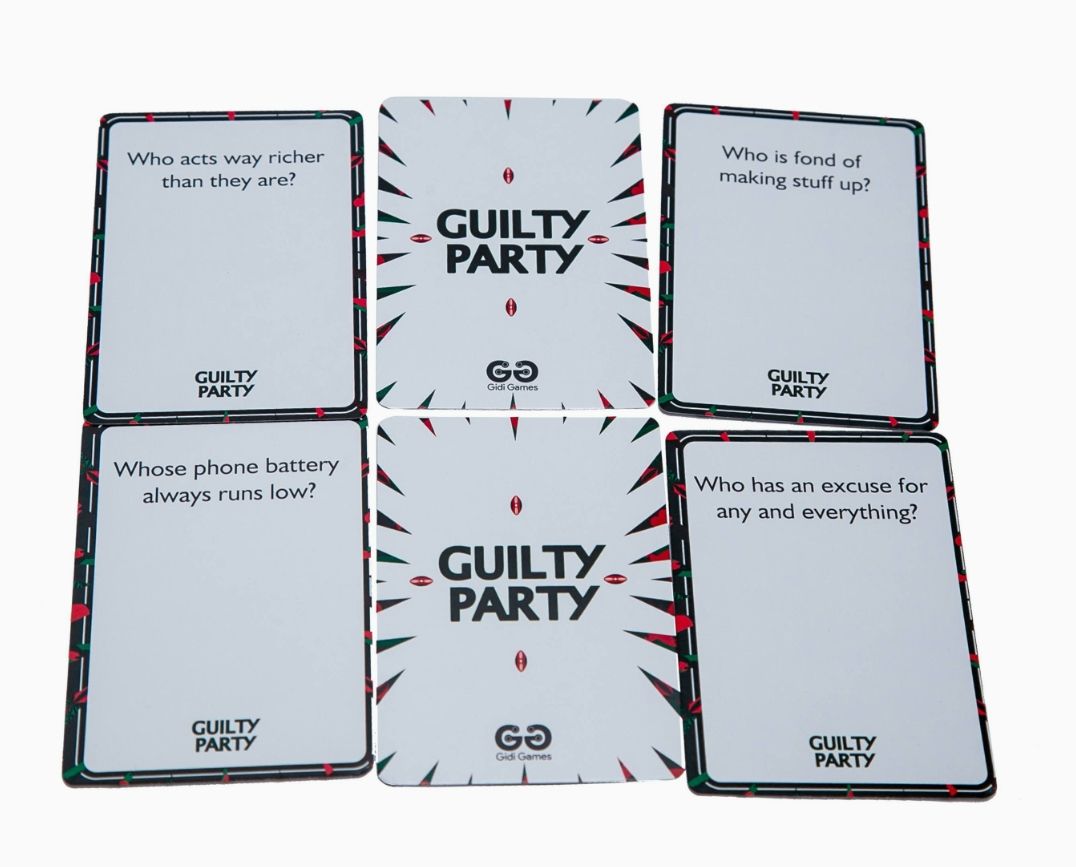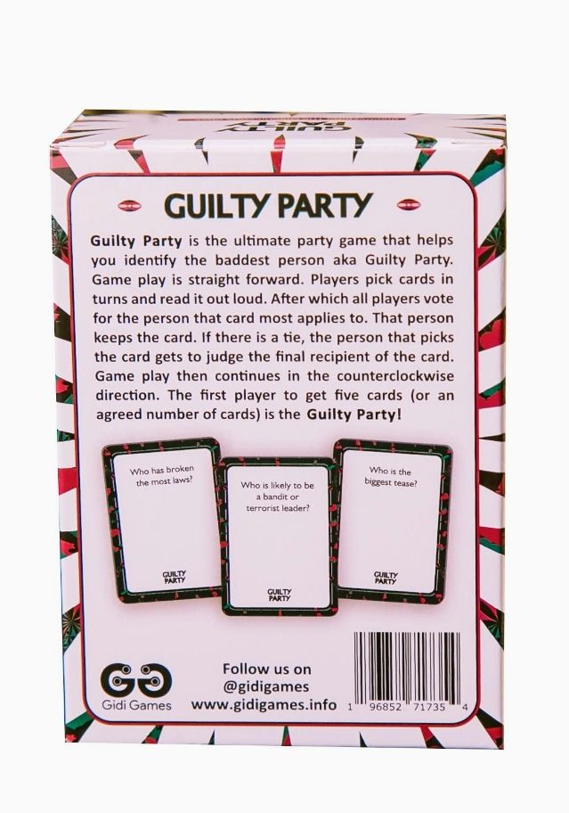 Guilty party is the ultimate party game that helps you identify the baddest person aka Guilty party. Game play is straight forward. Players pick cards in turns and read it out loud. After which all players vote for the person that card most applies to,that person keeps the card. If there is a tie,the person that picks the card gets to judge the final recipient of the card. Game play then continues in the counterclockwise direction. The first player to get five cards(or an agreed number of cards)is the Guilty party