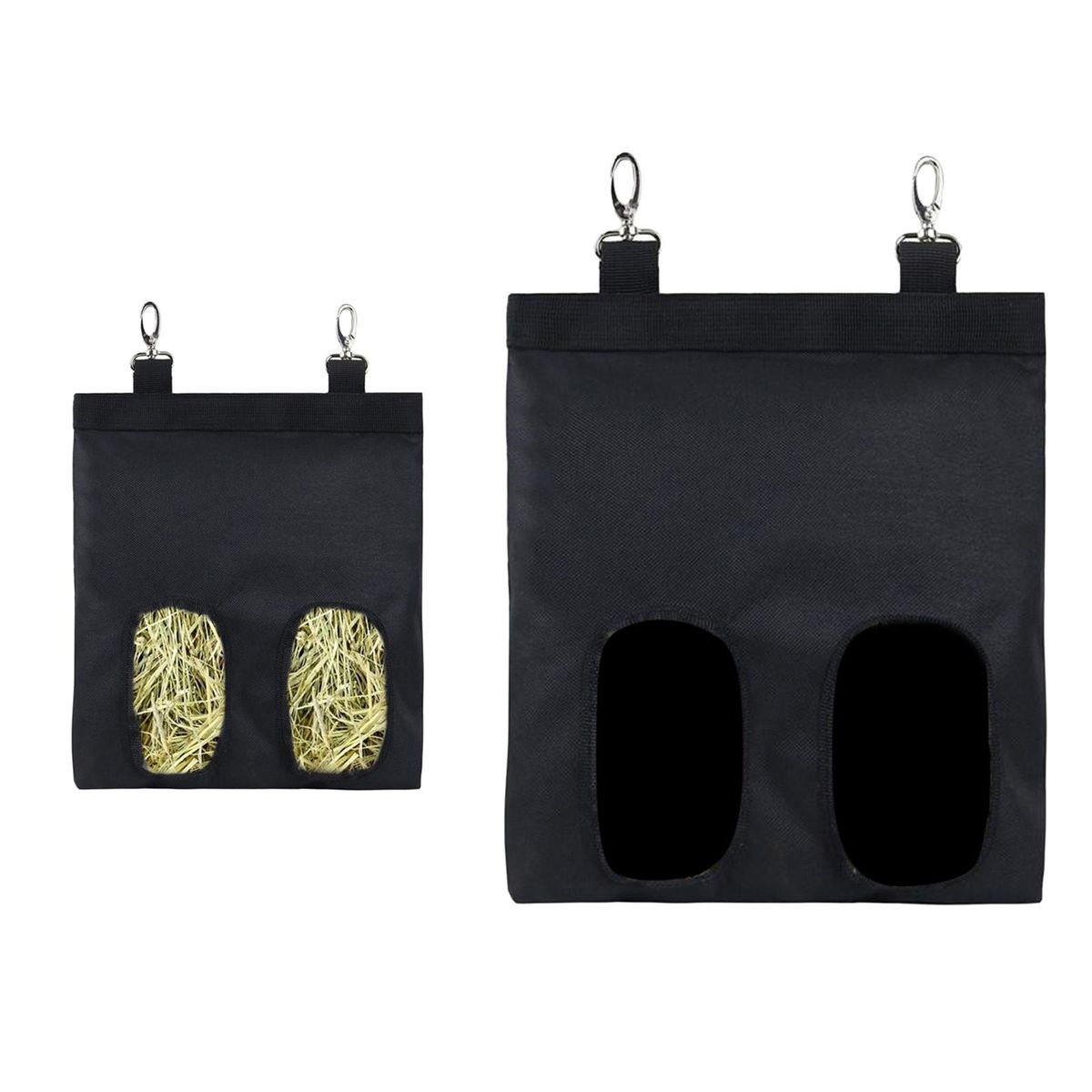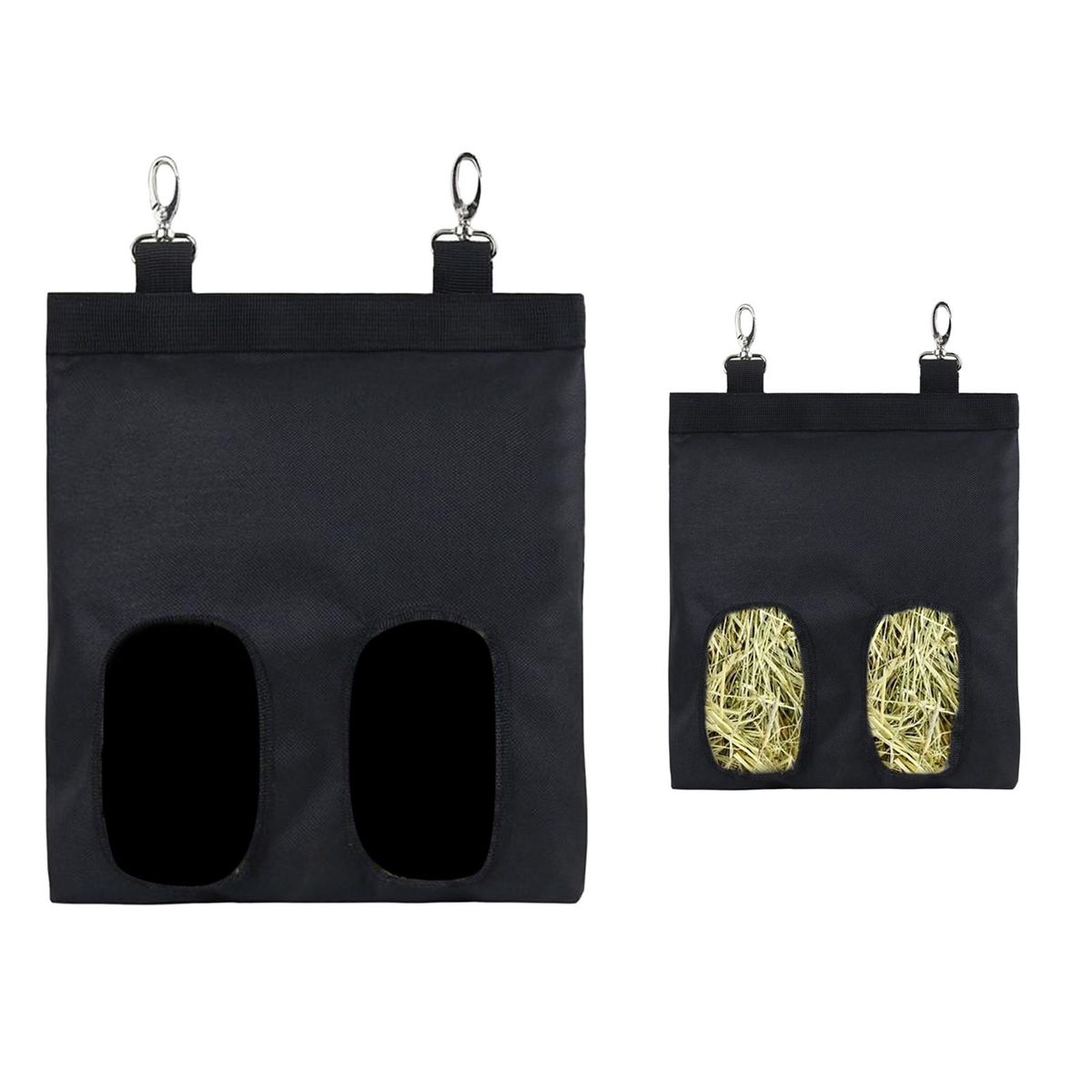 Pet Hay Bag Hanging Pouch Feeder Holder Feeding Dispenser Sack, made of durable oxford cloth.Designed with 2 snap hooks, for easy hanging onto the cage.Perfect for feeding small pet animals like guinea pigs, rabbits,etc.2 windows design can effectively reduce hay waste, and no more mess in cage.Size in 22x18.5cm, small and light, please measure your cage and check the product size whether it fits or not.