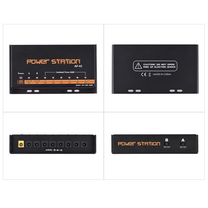 This universal pedalboard supplu probides 8 center negative barrel jacks with a total output of 2000mA. Outlets A and B are switchable to 9, 12 or 18 volts to effects that require higher cuttents or 9 volt pedals that can be operated on 12 or 18 volts for more dynamics and headroom. This pedal station is fully regulated to deliver constant voltage and protected against short circuits and overload.