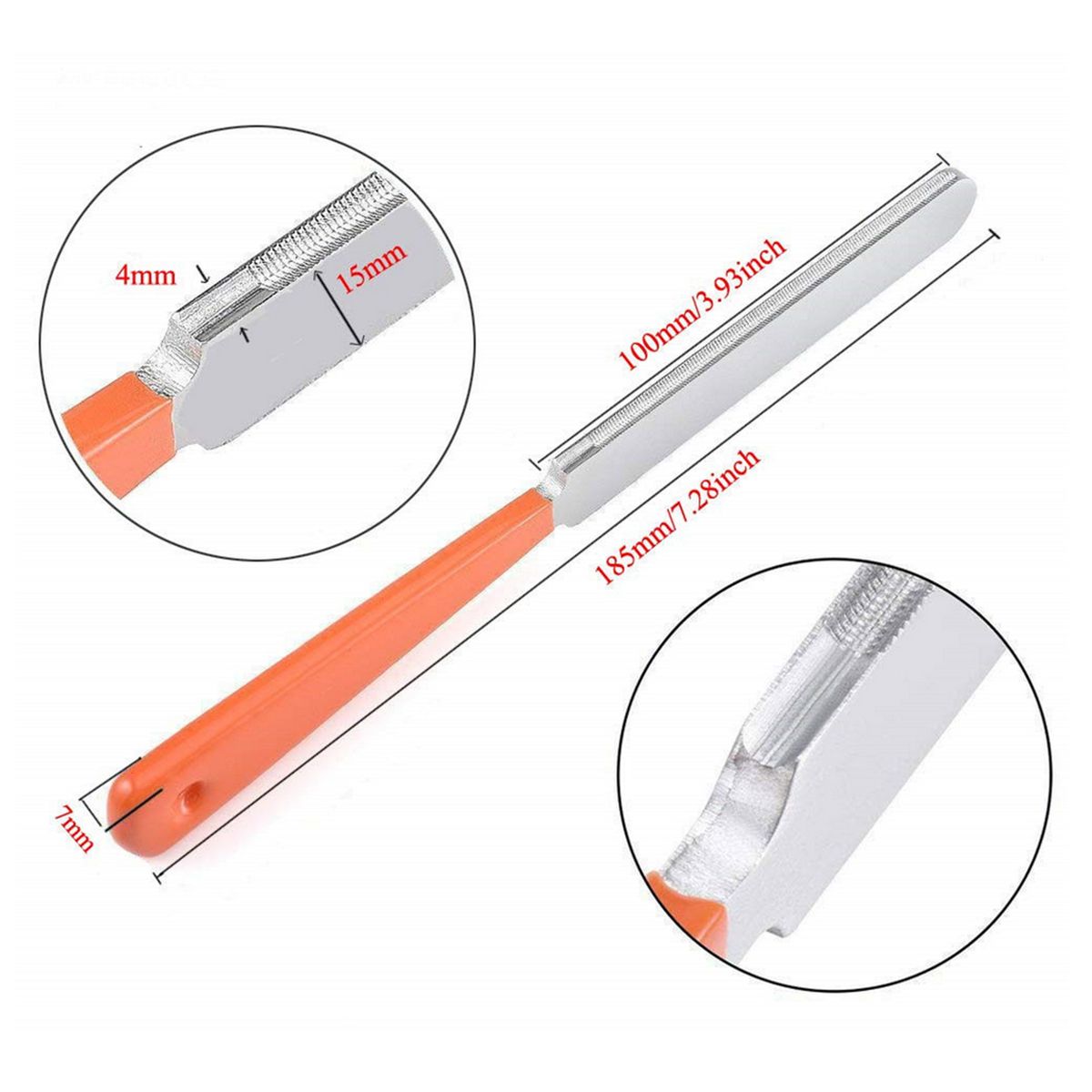 Made of stainless steel matrial, the file has the same filing size on both 2 edges. 4 quot; long filing surface and rubber handle for comfortable use.