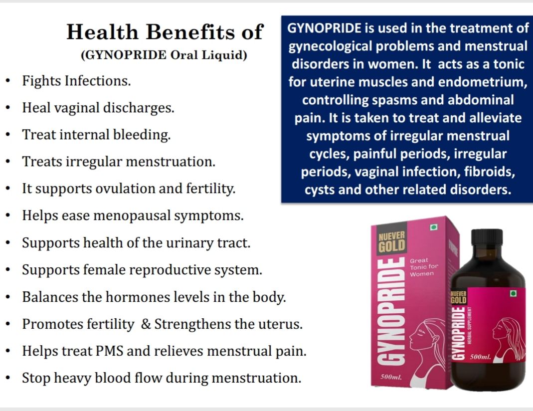 Gynopride is used in the treatment of gynecological problems and menstrual disorders in women. It acts as a tonic for uterine muscles and endometrium, controlling sperms and abdominal pain. It is taken and alleviate symptoms of irregular menstrual cycles, painful periods, irregular periods, vaginal infection, fibroids, cysts and other related disorders. It acts as a tonic for uterine muscles and endometrium, controlling sperms and abdominal pain. It is taken and alleviate symptoms of irregular menstrual.