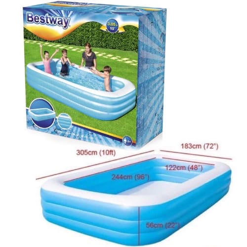 Brand new quality rectangular inflatable pool measuring 10ft x 6ft x 2.6ft height, with blower for easy pumping. it is suitable for adult use and for children under suppervision against drowning .