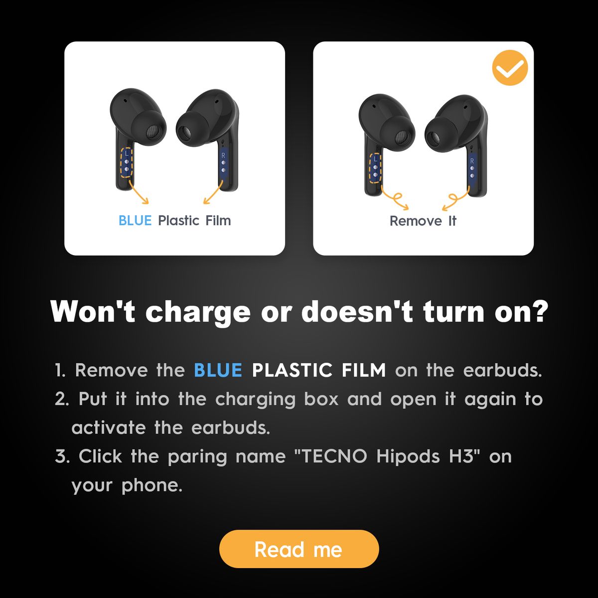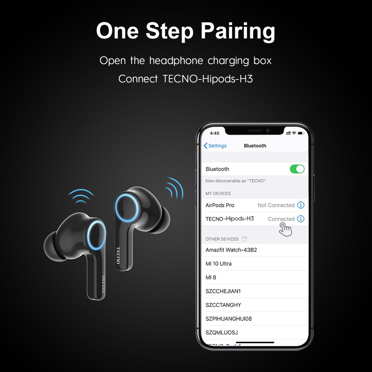 One Step Pairing: Pick up the two ear pods from the charging case, click the Bluetooth name "TECNO-Hipods-H3" and they will be paired automatically. Bluetooth 5.0 headphones provides stable connection and faster transmission ensuring low latency when playing games and watching videos.
