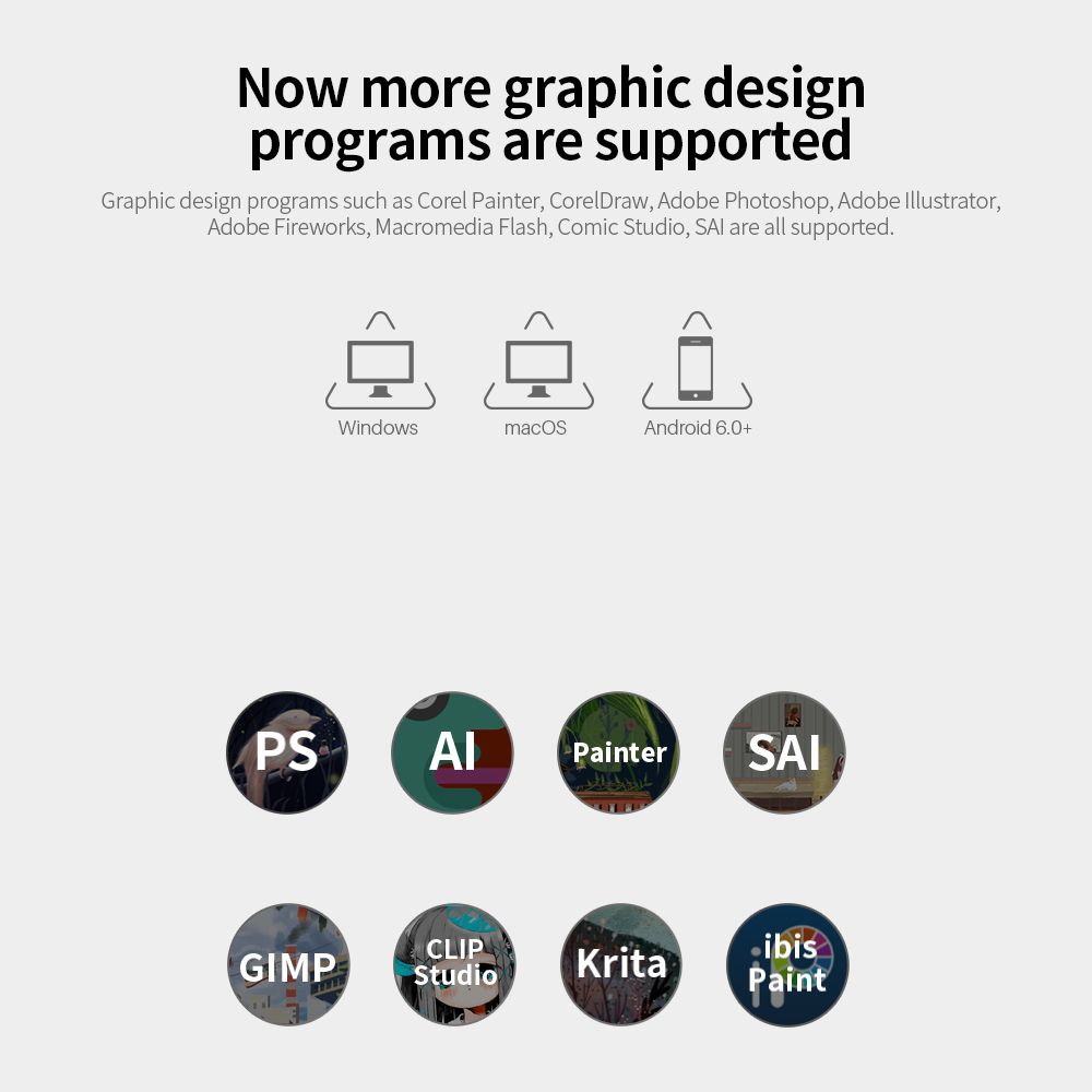 Support Windows 7 or later, MacOS 10.11 or later, Android 6.0 or later systems, compatible with Corel Painter, CorelDraw, Adobe Photoshop, Adobe Illustrator,Adobe Fire-works, Macromedia Flash, Comic Studio, SAI and other graphical applications.