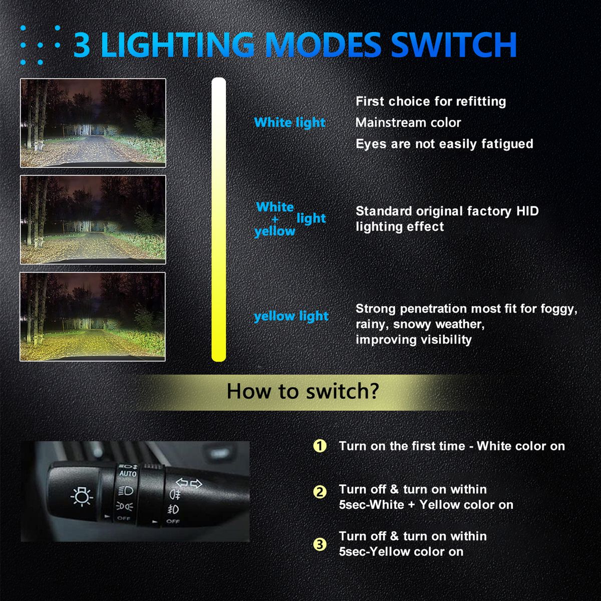 Features:3-Color Design: 3 colors can be switched at will, the headlight can switch between 6000K white light, 4300K white+yellow light, and 3000K yellow light to meet your driving needs. Simply turn on/off to switch to the desired light color.