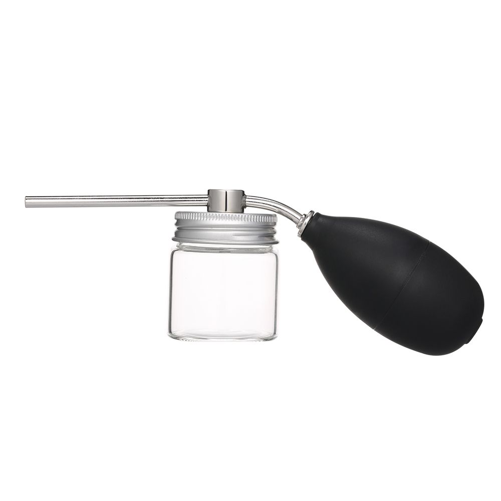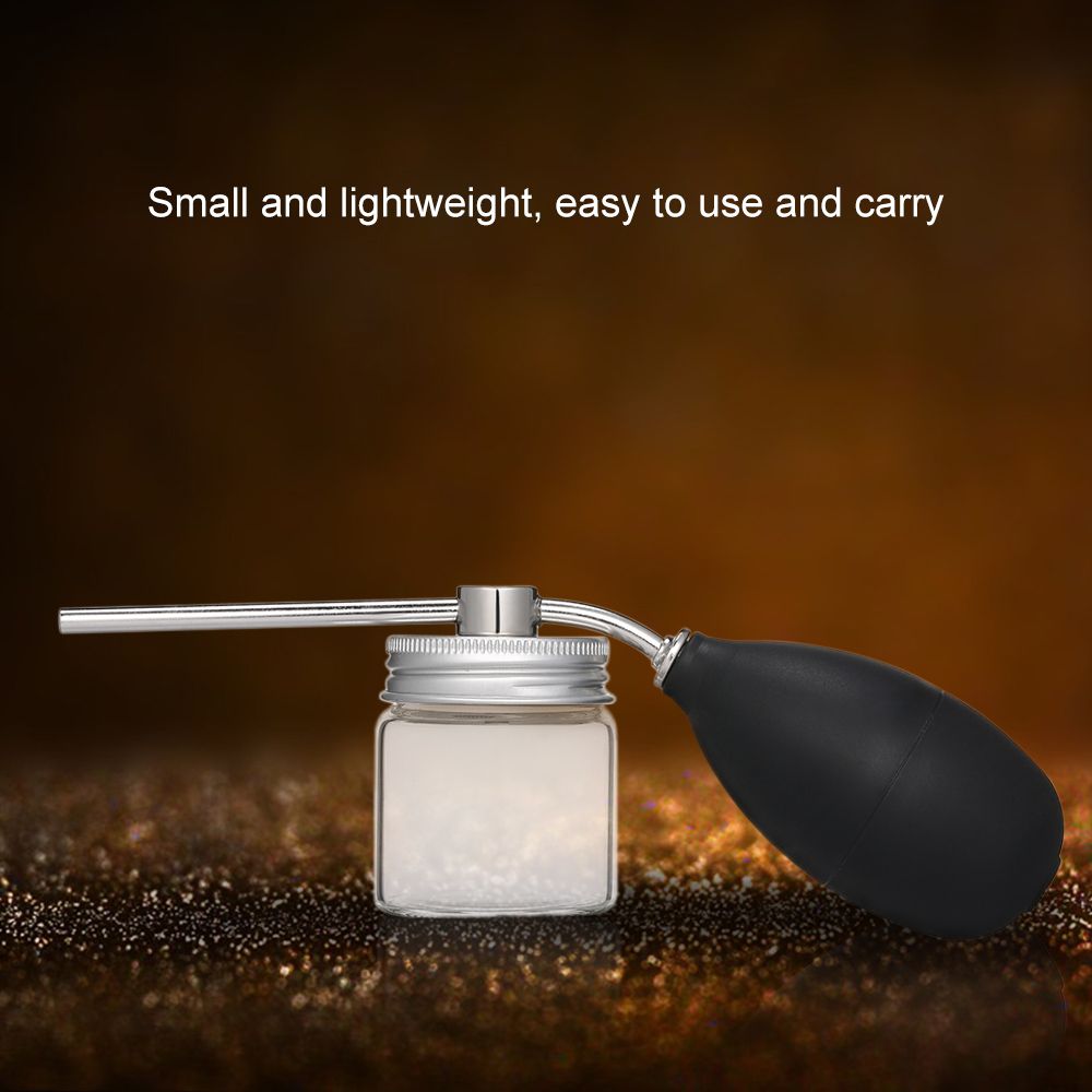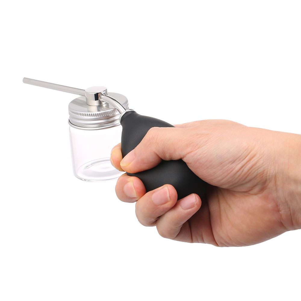 The hand-held inflatable bladder is designed to spray a proper amount of fiber powder.