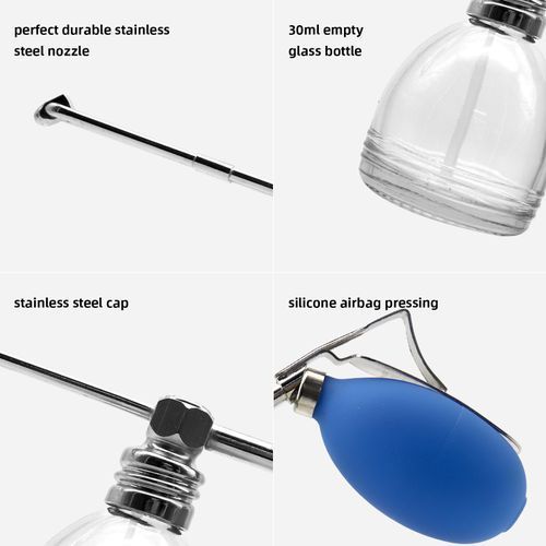 It is easy to squeeze the airbag when operating with one hand, 30ml empty glass bottle, perfect durable stainless steel nozzle, silicone airbag pressing.