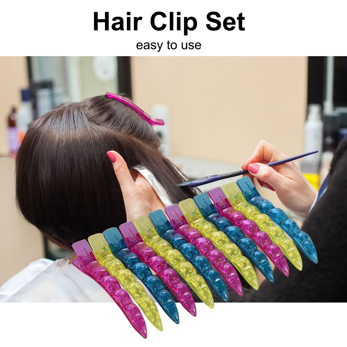 A set of 12pcs hair clips, comes in 3 colors, rose red, yellow and blue, can easily hold your hair when cutting, styling or blow-drying.