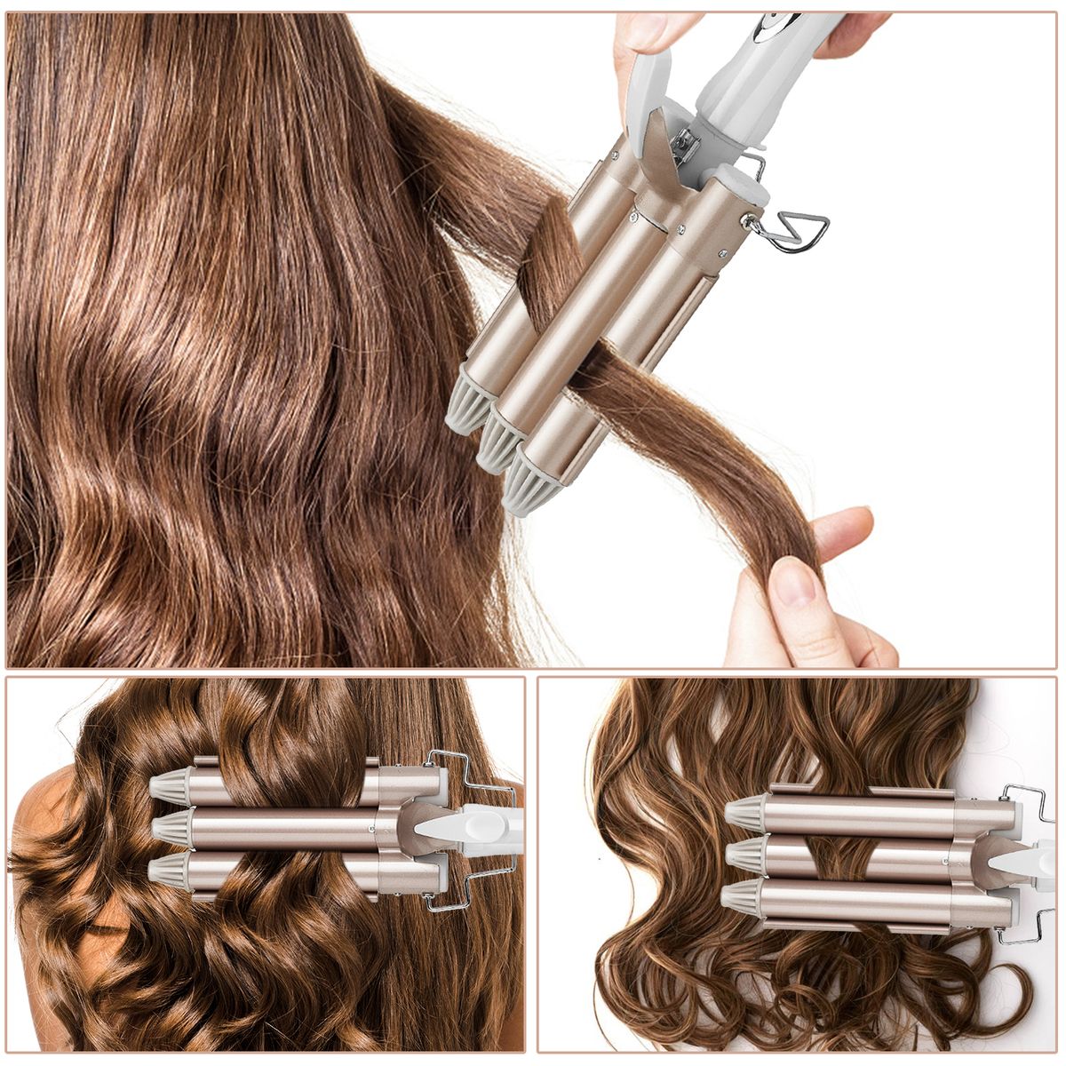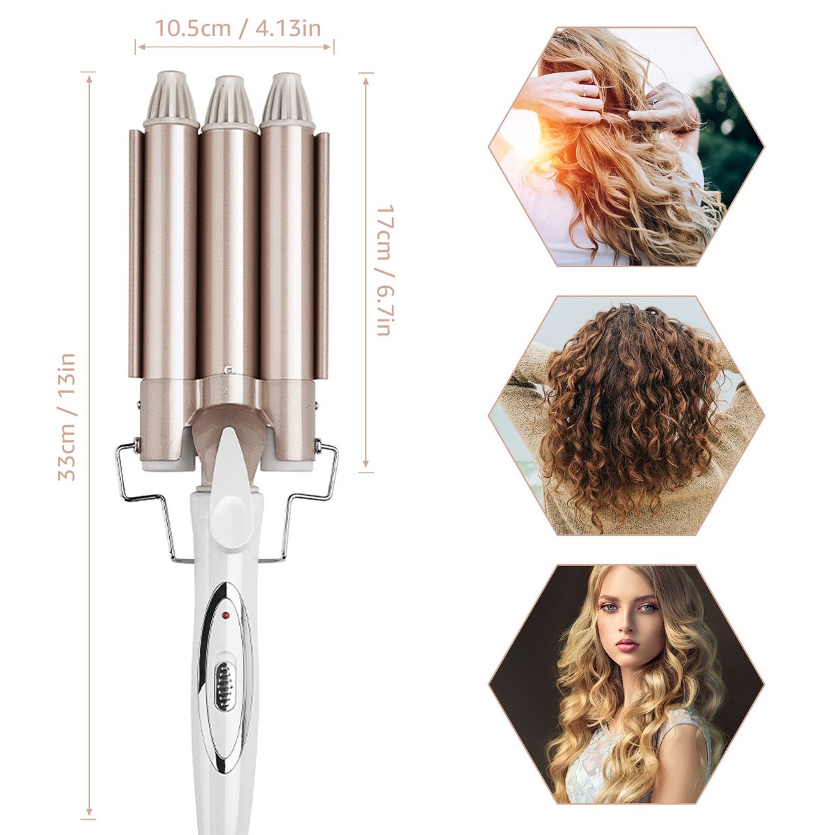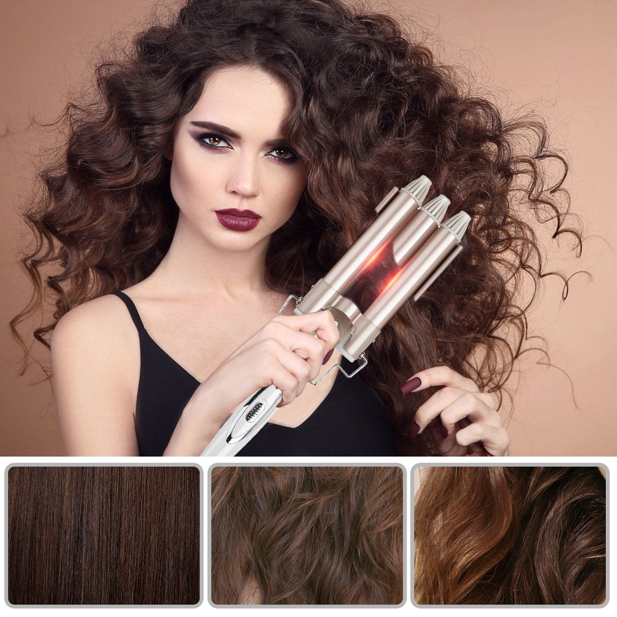 3 barrel hair curler, there are 22mm/25mm diameter of the barrel you can choose, work on all medium length to long hair, creating different sizes natural and beautiful quot;S quot; waves fit for dating, party, evening, wedding.
