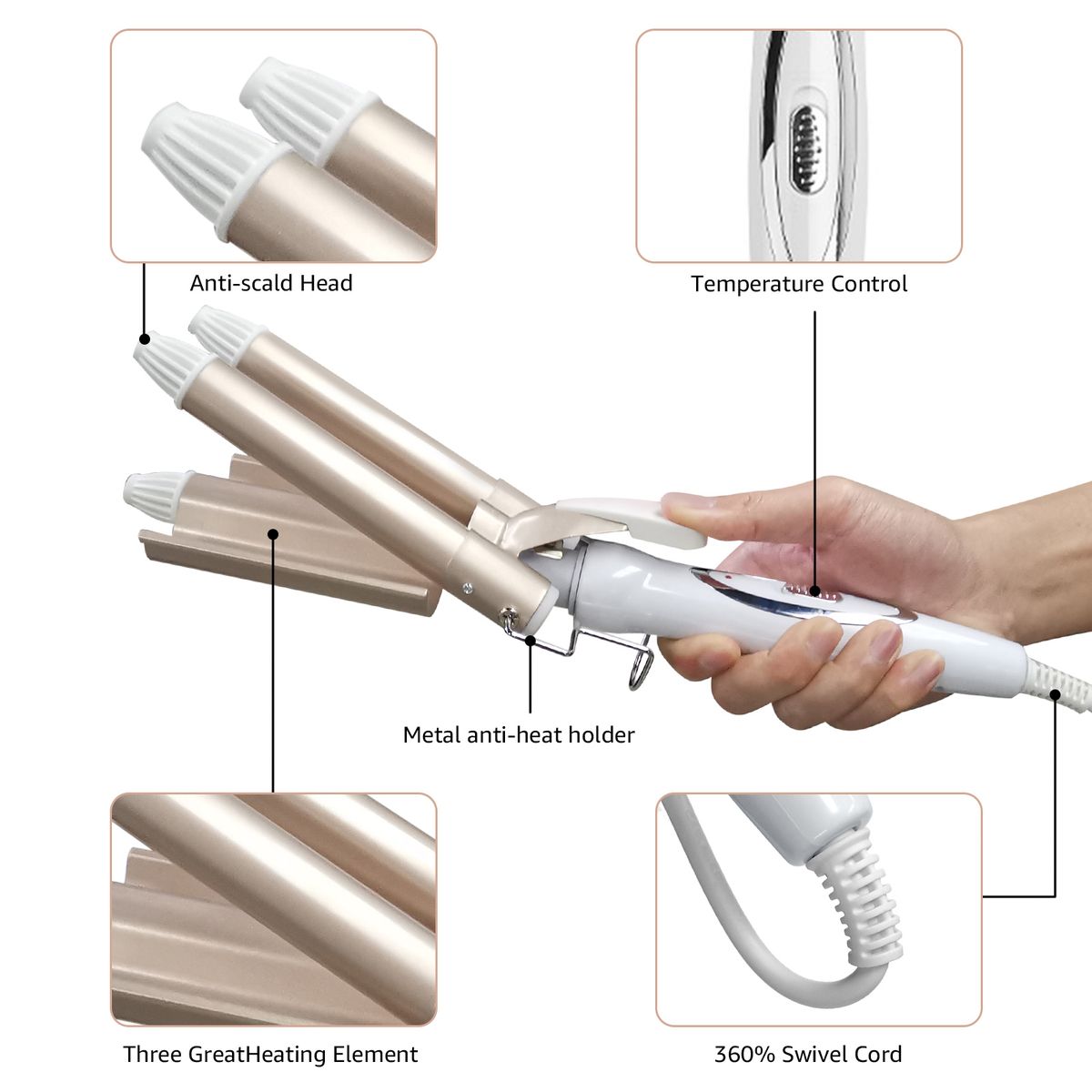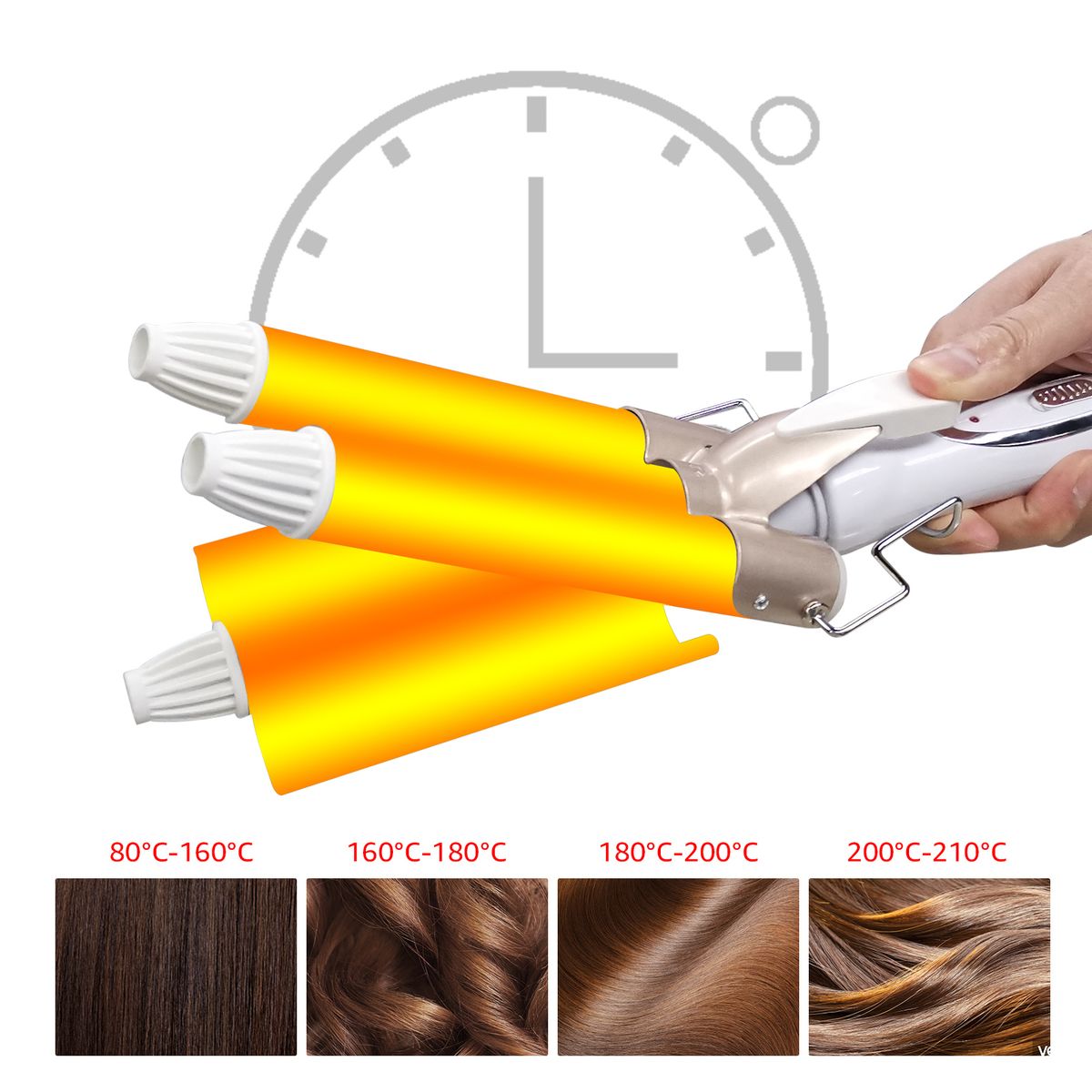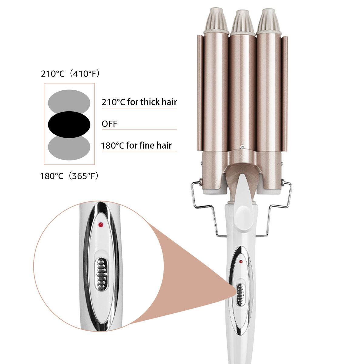 3 barrel hair curler, there are 22mm/25mm diameter of the barrel you can choose, work on all medium length to long hair, creating different sizes natural and beautiful quot;S quot; waves fit for dating, party, evening, wedding.