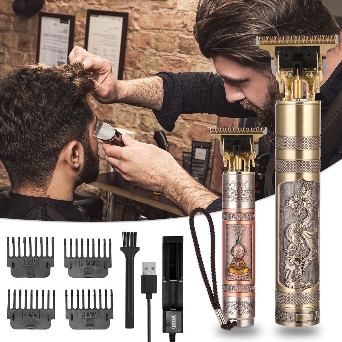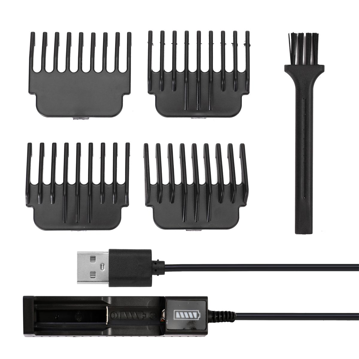 1 x Hair Trimmer,4 x Limit Comb (1pcs 1.5mm, 1pcs 2mm, 1pcs 3mm, 1pcs 4mm),1 x USB Cable,1 x Brush