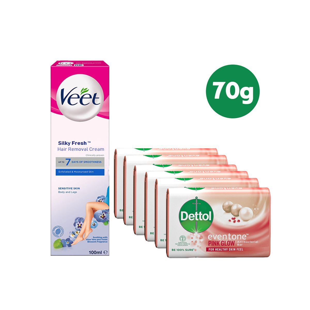 Healthy skin is a reflection of overall wellness. Glowing skin is a result of proper skin care. It means you can wear less make up and let skin shine through. This bundle is a careful selection of great care products from Reckitt Benckisers, world renowned health and home hygiene company.Experience silky smooth skin and a delightful scent with Veet hair removal cream, now Silk and Fresh Technology, and lotus milk and jasmine fragrance for normal skin. Get touchably smooth skin that lasts up to twice as long as shaving. Veet Hair Removal cream effectively removes even the shortest hair.Dettol