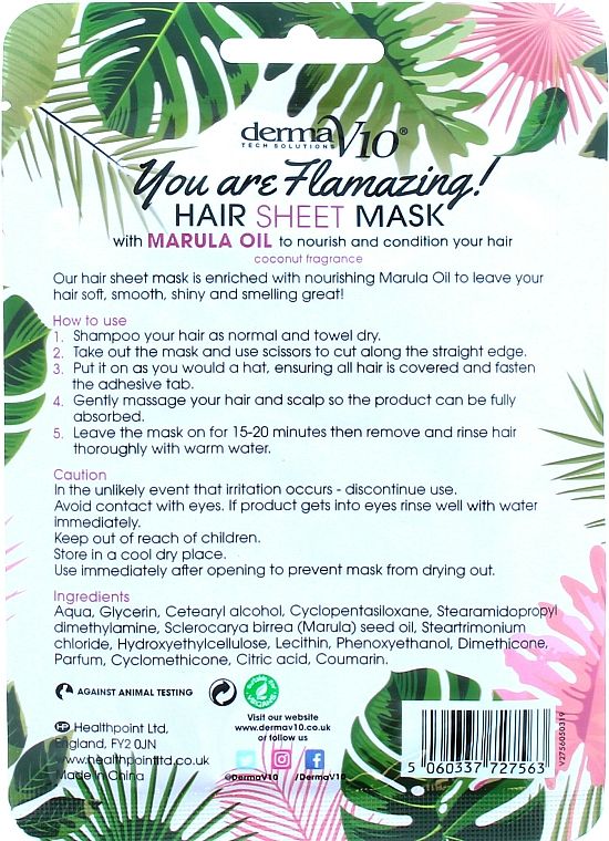 Dermav10 You are Flamazing! Hair sheet mask with MARULA OIL to nourish and condition your hair with coconut fragrance.