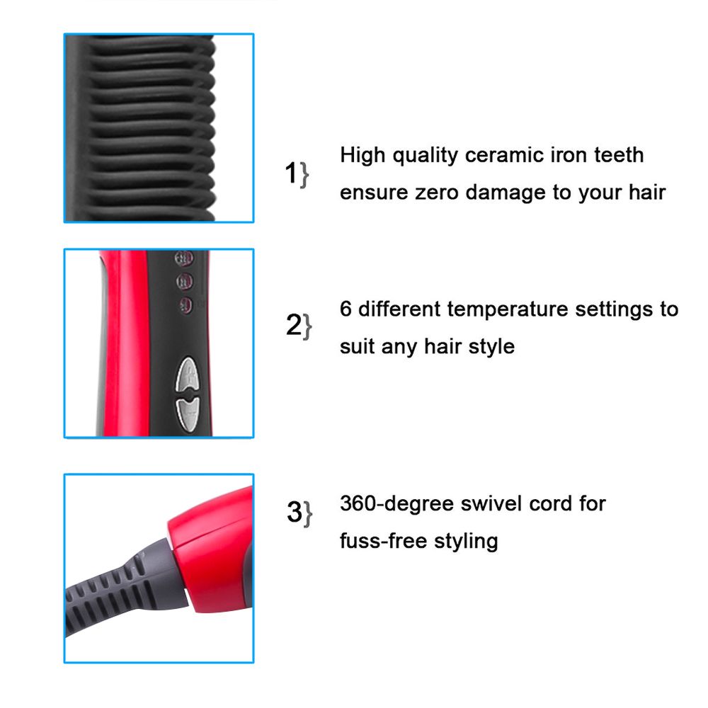 Beat the salon! - salon quty results from the comfort of your home, absolutely no more bad hair days, time to enjoy your new runway style! gorgeous sleek salon hair styles every day at home and away from home. lightweight compact for travel, dual voltage 110v~240v Versatile 3 in 1 design: everything you need for a gorgeous and healthy hair, detangling comb, hair brush, hair straightener, beard straightener and anion hair maager all in one! straighten, smooth, curl, flip and style with one profeional tool. designed with 360-degree rotating base cord that allows you to style your hair from any angle and get the most profeional-looking result; smart simple one-touch on and advanced liquid crystal display lets you control and monitor its temperature with ease. Style with speed and ease: straightening hair for women and man is now as easy as brushing your hair and beard! this brush delivers gentle, even heat around each strand. no more flattening or frying your trees. effortlely comb through from roots to ends. no matter how unruly your curls, the ceramic coating gives you silky straight hair that's easy to style. aured safety from scalding or burning Efficient and safe: designed for rapid heating with positive temperature coefficient (ptc) heating technology that gets the straightener brush hot within 30 seconds and maintain optimum heat levels, 5~10 times faster than traditional straighteners! sturdy, smooth nylon ball tipped teeth for tangle-free glide to prevent damage to the scalp. ceramic tourmne technology reduces static, locks in moisture and leaves hair silky smooth with brilliant shine. backed by ce, fcc, and etl certification. Anti-scald technology: your safety is our first priority. this hair straightening device is constructed of quty dupont plastic materials, and features a patented ce- and fcc-certified design to prevent scalding and burning. all components are manufactured with the highest quty materials and inspector-certified.