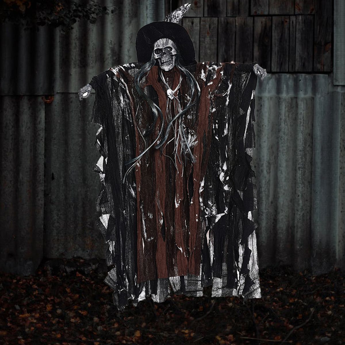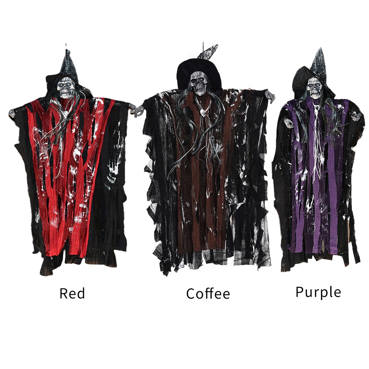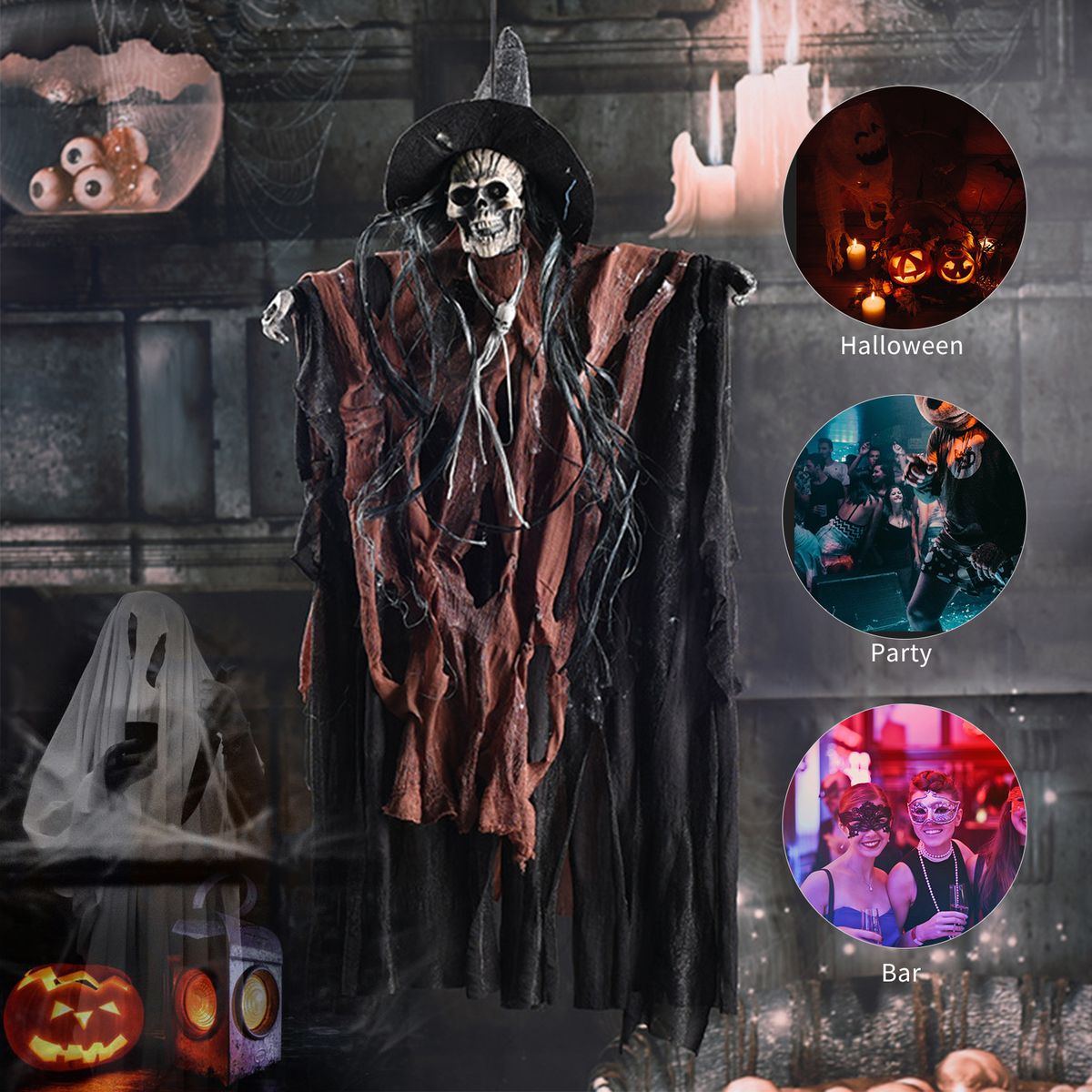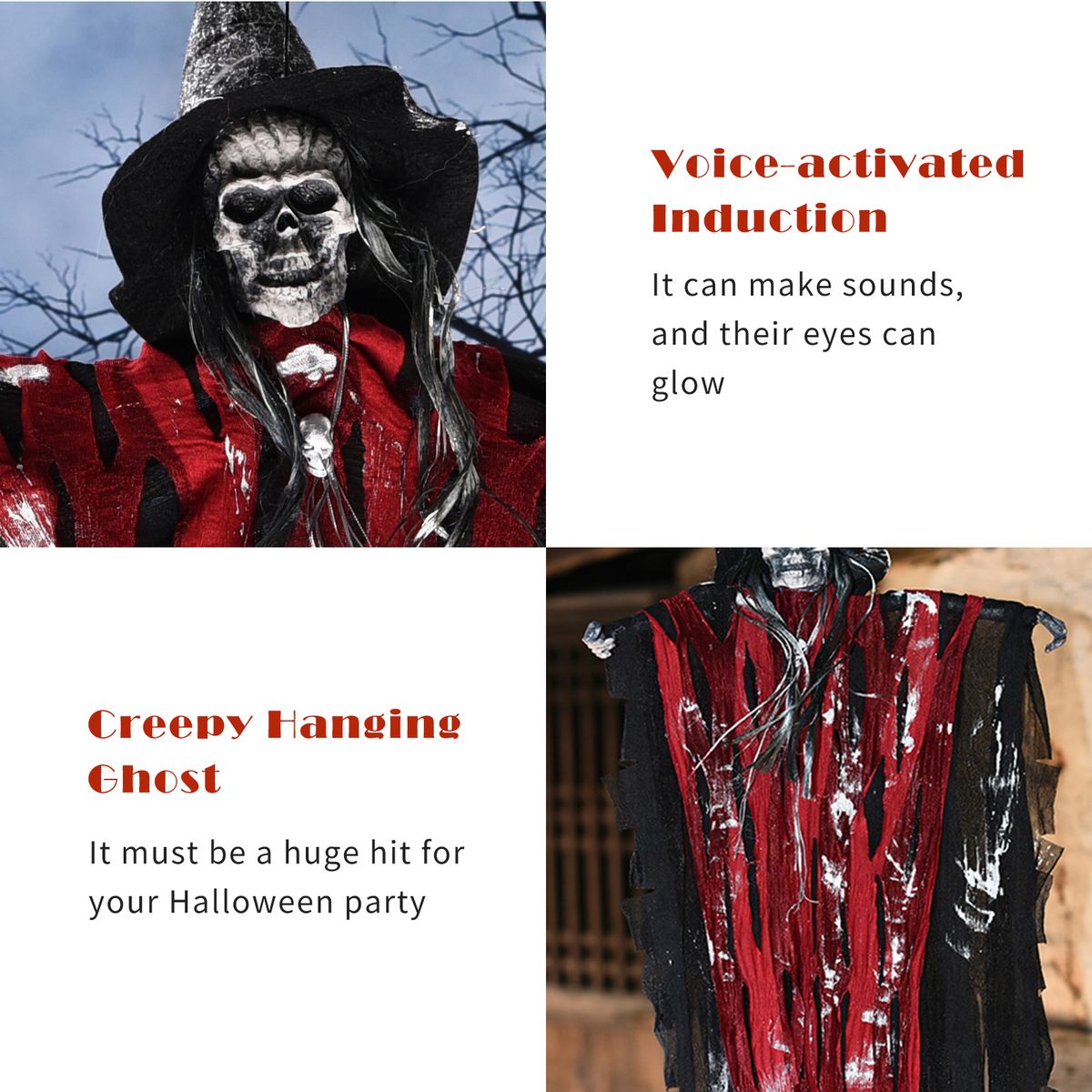 The voice-activated induction hanging ghost can make sounds, and their eyes can glow. Beautiful decorations for Halloween parties can hang in front of the house, you also can hang them on the tree, bedroom, wall, veranda, and anywhere that can be hung.