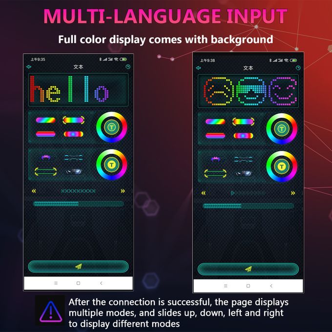 A variety of Functions: Picture Mode: A total of 70 kinds of pictures, pictures can be added 20PCS by DIY; Animation Mode: A total of 45 kinds of animation for you to choose. Multi-language input, full color display comes with background. Mobile phone BT connection, text can be edited, background pattern can be changed. Support APP take photo and upload.