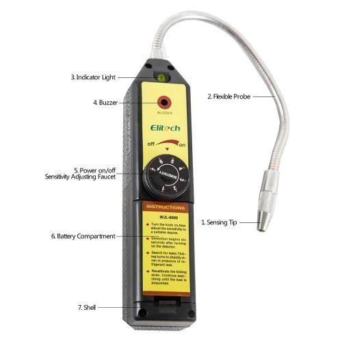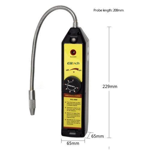 Description:This halogen leak detector is an exquisite unit, with its feature of higher performance versa lower price, has powerful function and high sensitivity, and is stable and easy to operate.Detect leaks of all halogenated refrigerants in any refrigeration, air-conditioning systems etc. The typical examples of halogenated refrigerants are:o CFCs e.g. R12, R11, R500, R503 etc;o HCFCs e.g. R22, R123, R124, R502 etco HFCs e.g. R134a, R404a, R125 etco Blends e.g. AZ-50, HP62, MP39 etcDetect Ethylene Oxide gas leaks in hospital sterilizing equipment (it will detect the halogenated carrier gas)ELITECH WJL-6000 air conditioning Halogen Leak DetectorDetect SF-6 in high voltage circuit breakersDetect most gases that contain chlorine, fluorine and Bromine (halogen gases)Detect cleaning agents used in dry cleaning applications such as perchloroethyleneDetect halogen gases in fire extinguishing systemDetects all kinds of halogenated refrigerantsSensitivity adjusted at any time and it can be adjusted automatically to the best state of detectingAudible alarm and flashing light indicator upon gas leakage detectedInner precise IC with ultra-low consume circuit design, more stable, longer battery timeTwo color visual display of battery voltageExcellent sensor, high sensitivity, longer use timeOperating Temperature : 0 ~ 52 Celsius (30 ~ 125 Fahrenheit)Maximum sensitivity : 6 gr/yr for all halogenated refrigerantsBattery life : Approx. 50 hours for normal useResponse time : InstantaneousWork mode : Continuous, no limitationFixed Probe Length : Approx. 200mmWarm-up time: Approx. 6 secondsReset Time: 2 to 10 secondsmaterial: metalPower Supply: 4pcs x AAA 1.5V batteries (not included)Dimensions : Approx. 229mm (L) x 65mm (W) x 65mm (D) (9.02' x 2.56' x 2.56' inch)