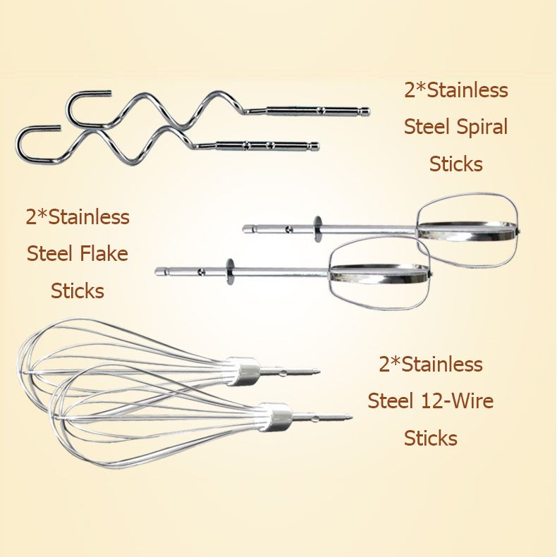 Accessories: 6 Sticks(2*Stainless Steel 12-Wire Beater, 2*Stainless Steel Flake Beater, 2*Stainless Steel Spiral Beater)