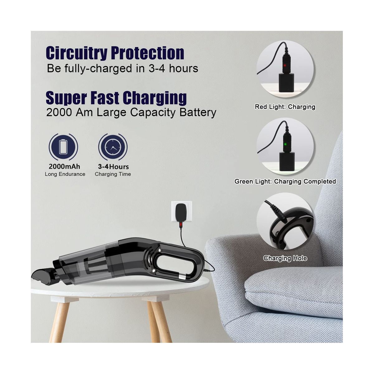 The portable hand vacuum cordless rechargeable with no cable and quick charge tech. Its larger power capacity ensures a continuous 18~30 mins working time, and it can be fully charged in 3.5 hours, which is convenient to use, work with independent battery protection.