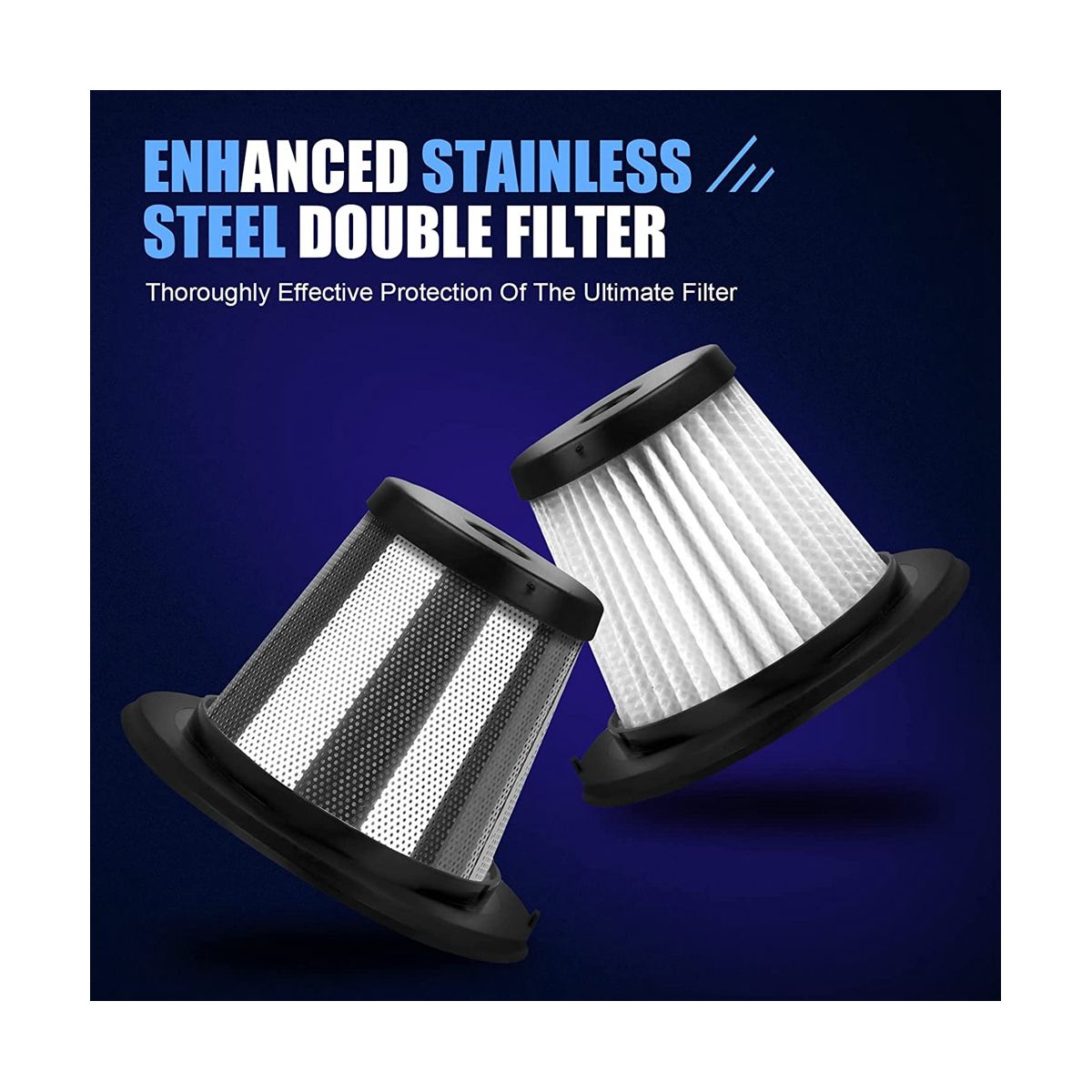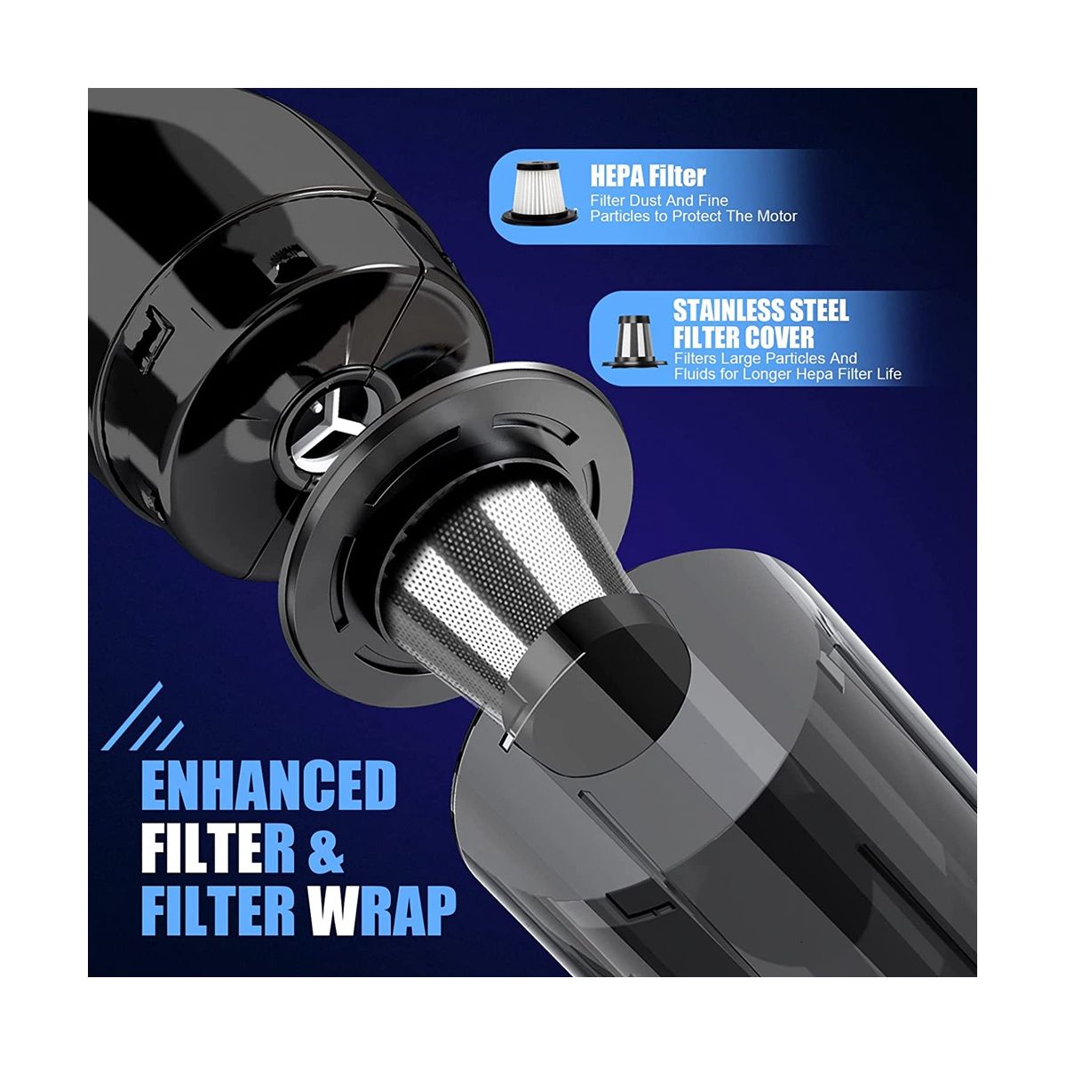 This mini handheld vacuum has an advanced design and enhanced stainless steel dual filter. The outer stainless steel filter cover effectively prevents larger particles and gravel from damaging the HEPA filter. The energy efficiency rating of the internal HEPA filter is better than H13, which can capture 99.99% of microparticles. And the HEPA filter can be reusable and washable, Which will help your car vacuum have powerful suction and longer service time.