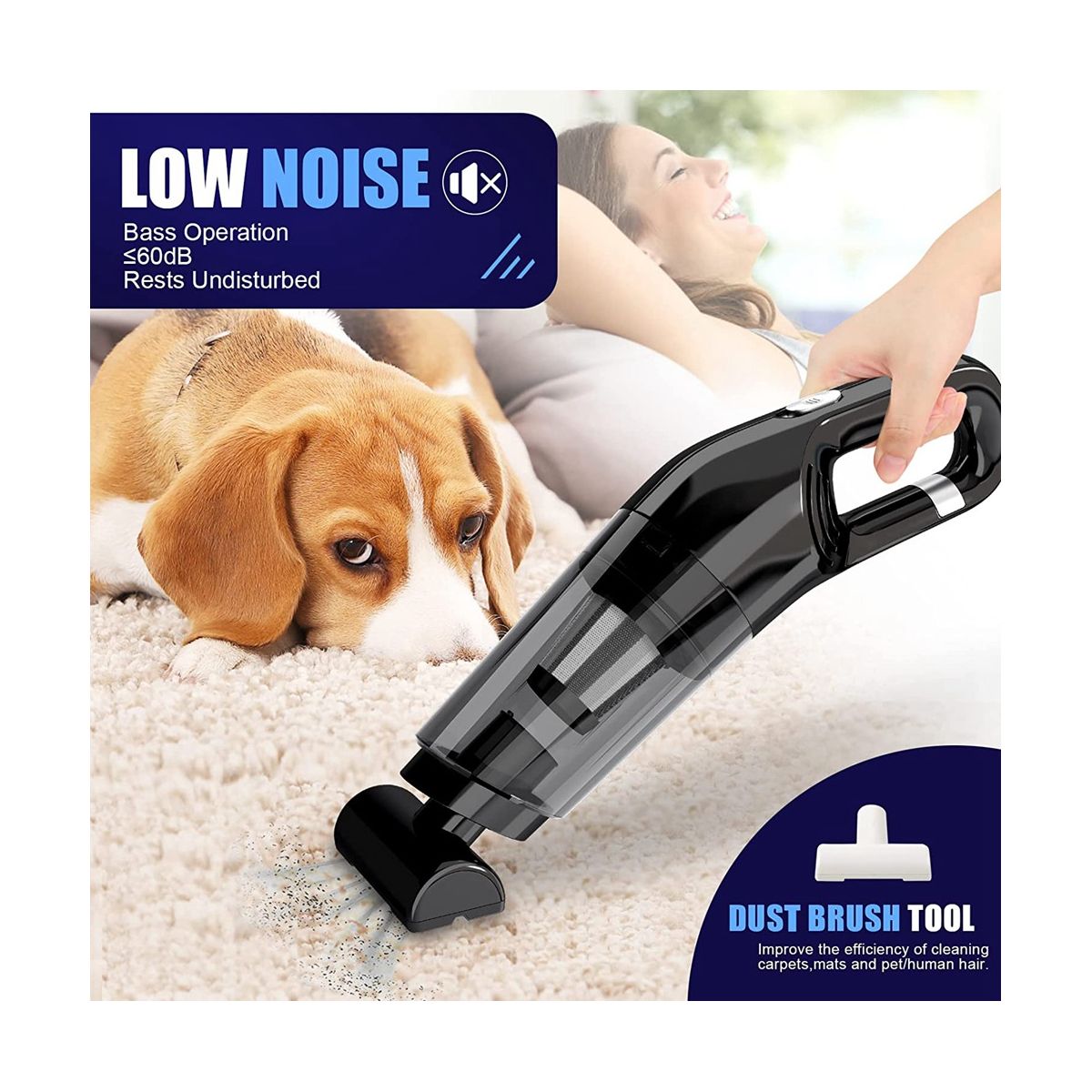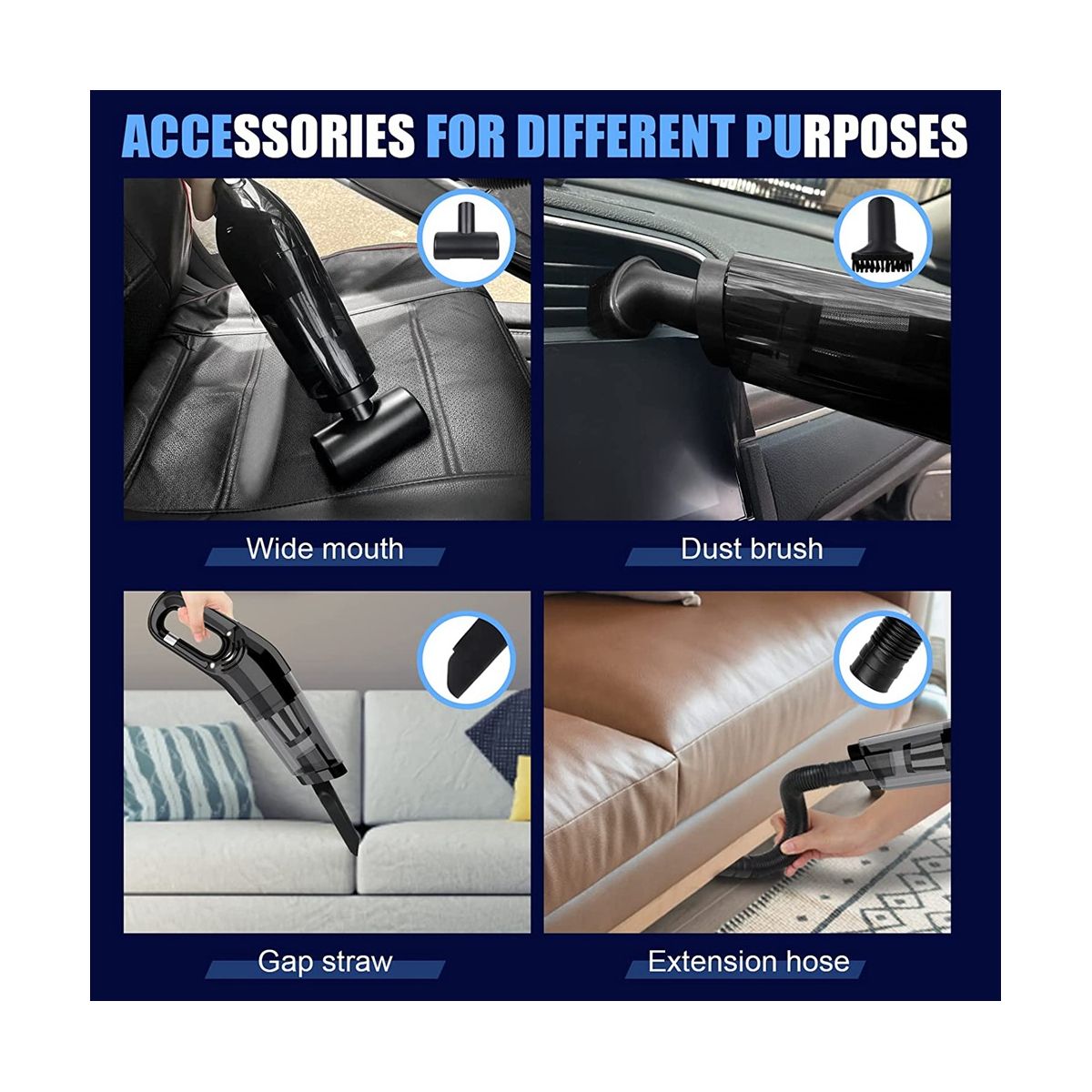 Our hand vacuum cordless rechargeable equipped with 3 different shapes of nozzles to meet all usage requirements. The crevice nozzle is designed for cleaning hard-to-reach narrow places, such as under sofas, car seat spaces, and laptops. It is recommended to use the brush nozzle, when cleaning car air outlets and pet hair on carpets. The wide-mouth suction nozzle can be used to large particles, like food crumbs and so on.