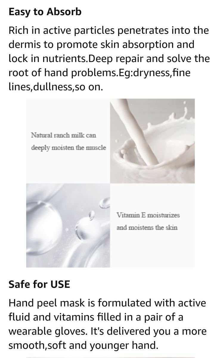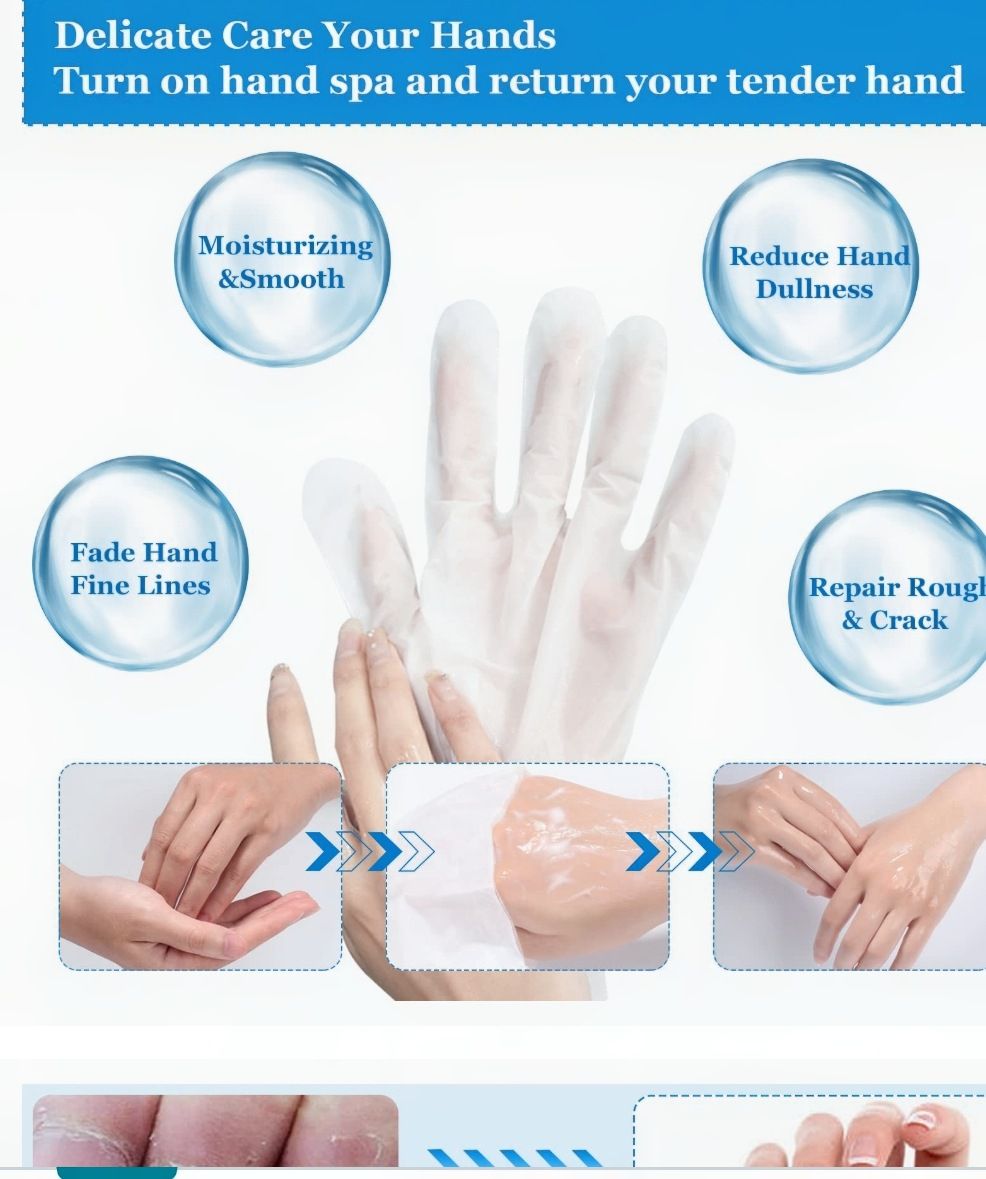 Features & detailsHEALTH & HARMLESS - Our Hand Mask Gloves is made from high quality and safe ingredients. Natural nourishing ingredients, supplement a variety of nutrition, clean pores and dirt, and promote nutrient absorption for your hands.Moisturising & nourishing- Soothing and moisturising hand mask, deeply moisturize and repair your damaged, dry and cracked skin. Strengthen and repair your damaged nails, soften cuticles, remove dead skin and calluses.EASY TO USE - Specially designed gloves to immerse your hands is skin-friendly, beautiful and free, surfing the Internet, doing housework, playing with mobile phones while enjoy your hand beauty care.Wherever you are at office or at home, it is convenient to apply them. Clean & dry your hands, open the package and take the hand mask out, then put your hands in and seal the masks, then relax for 20 minutes.Perfectly fits Women and Men stretchable size provide more space for your hands. Best gift for your families and friends.