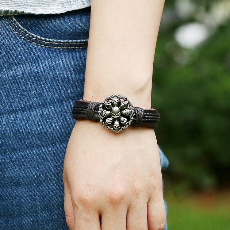 European and American style hand bracelets, hand-woven bracelets, retro bracelets. Hand-woven punk style alloy skull leather bracelet |