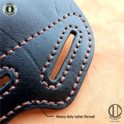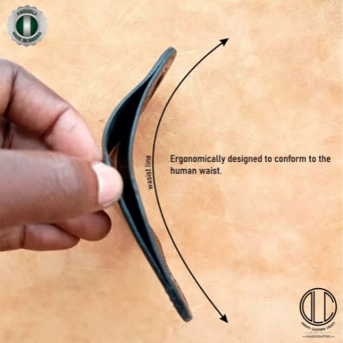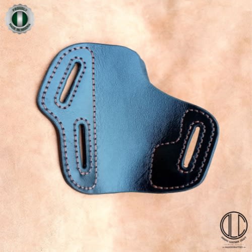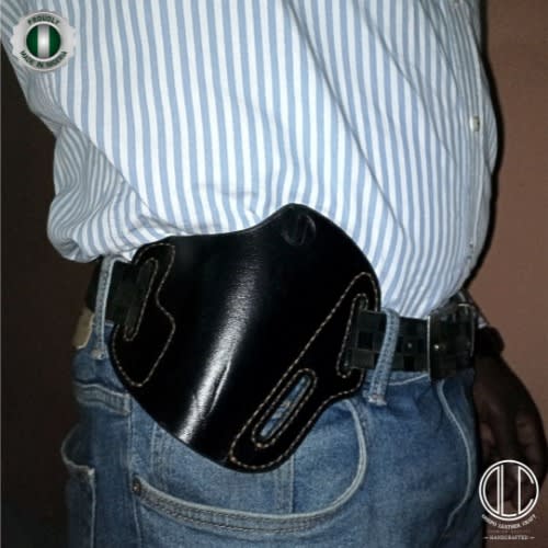 This Black Pistol Holster (Right-Handed, Open Style) is patterned and handcrafted by OhepoLeatherCraft (OLC) using fine genuine Nigerian leather. The Pistol Holster is an open style holster with a two way belt line and it will perfectly fit your Glock 17, .40 S&W Glock pistols, 1911s, Berettas 92s.