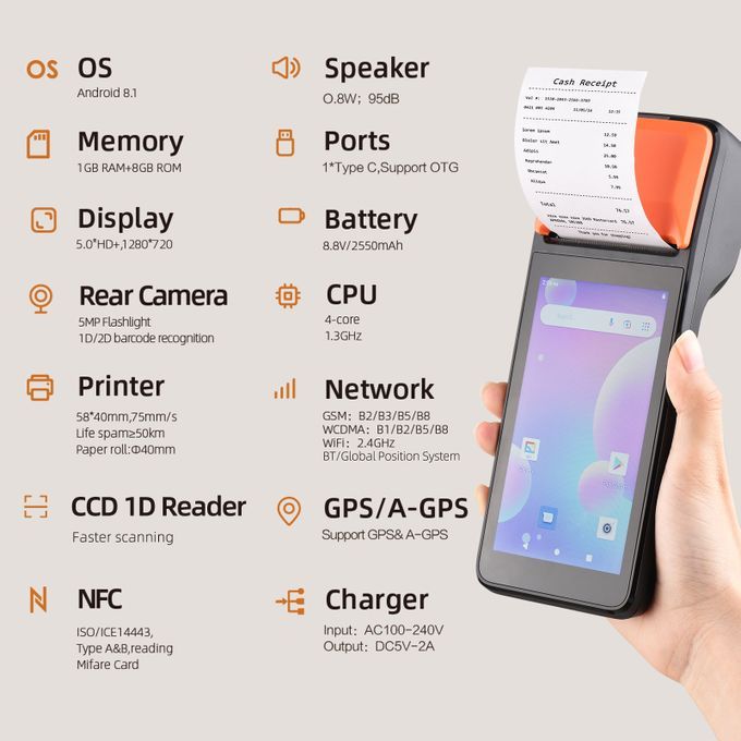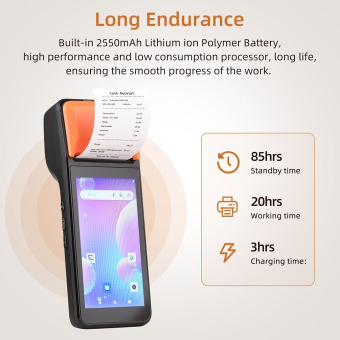 Built-in POS receipt printer uses 58x38mm