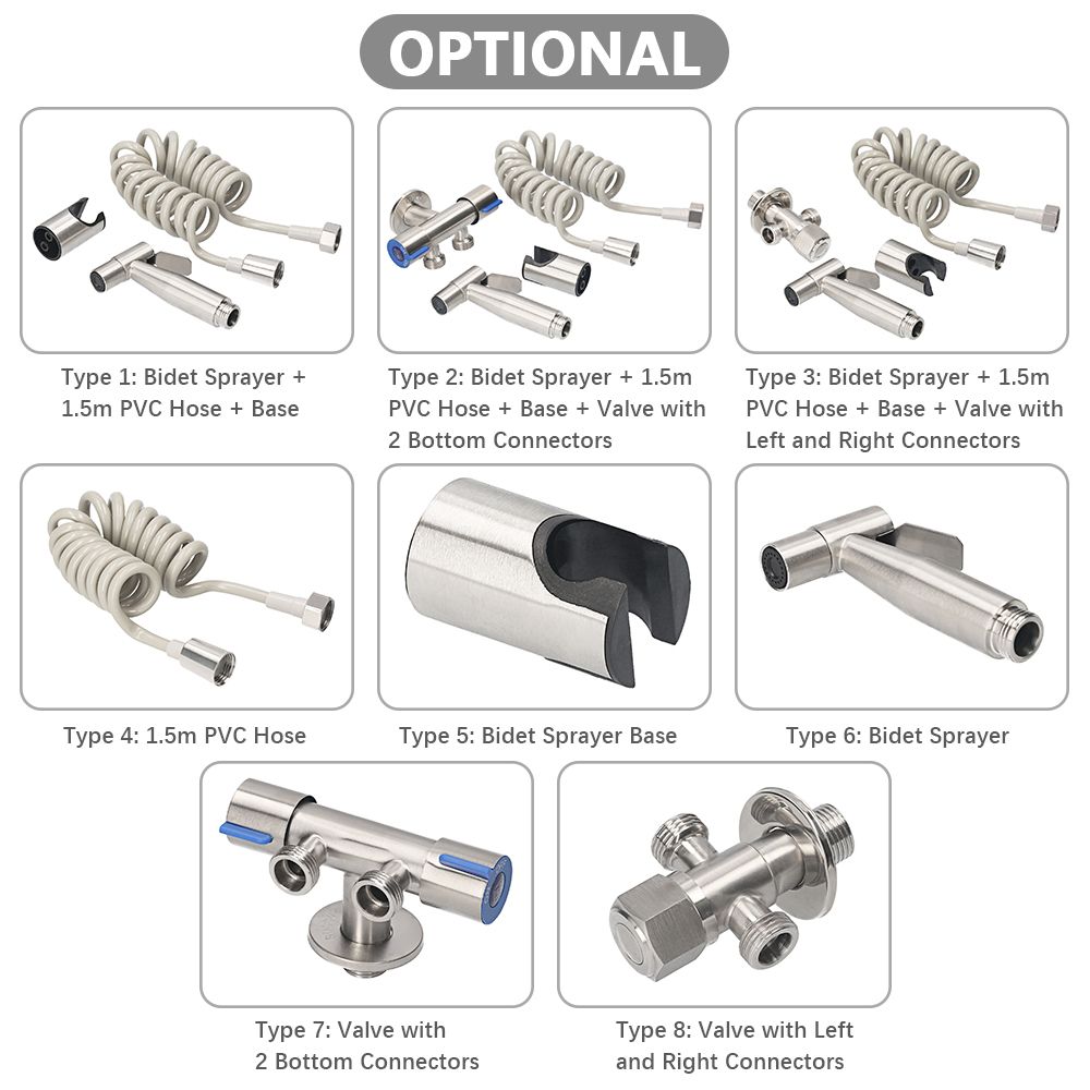 【8 Types for Option, Premium Quality】Mainly made of high-quality stainless steel and PVC, adopts wire drawing process surface treatment, rustproof and durable. 8 types for option, including 3 different bidet sprayer sets and 5 single accessories.