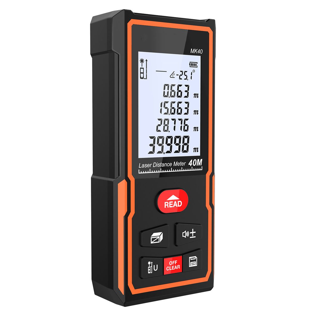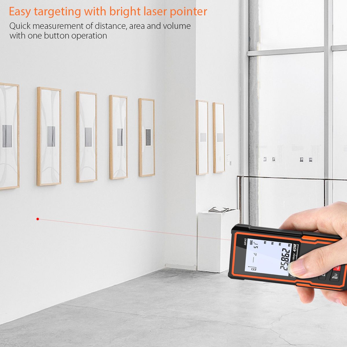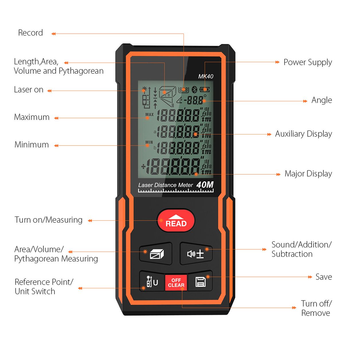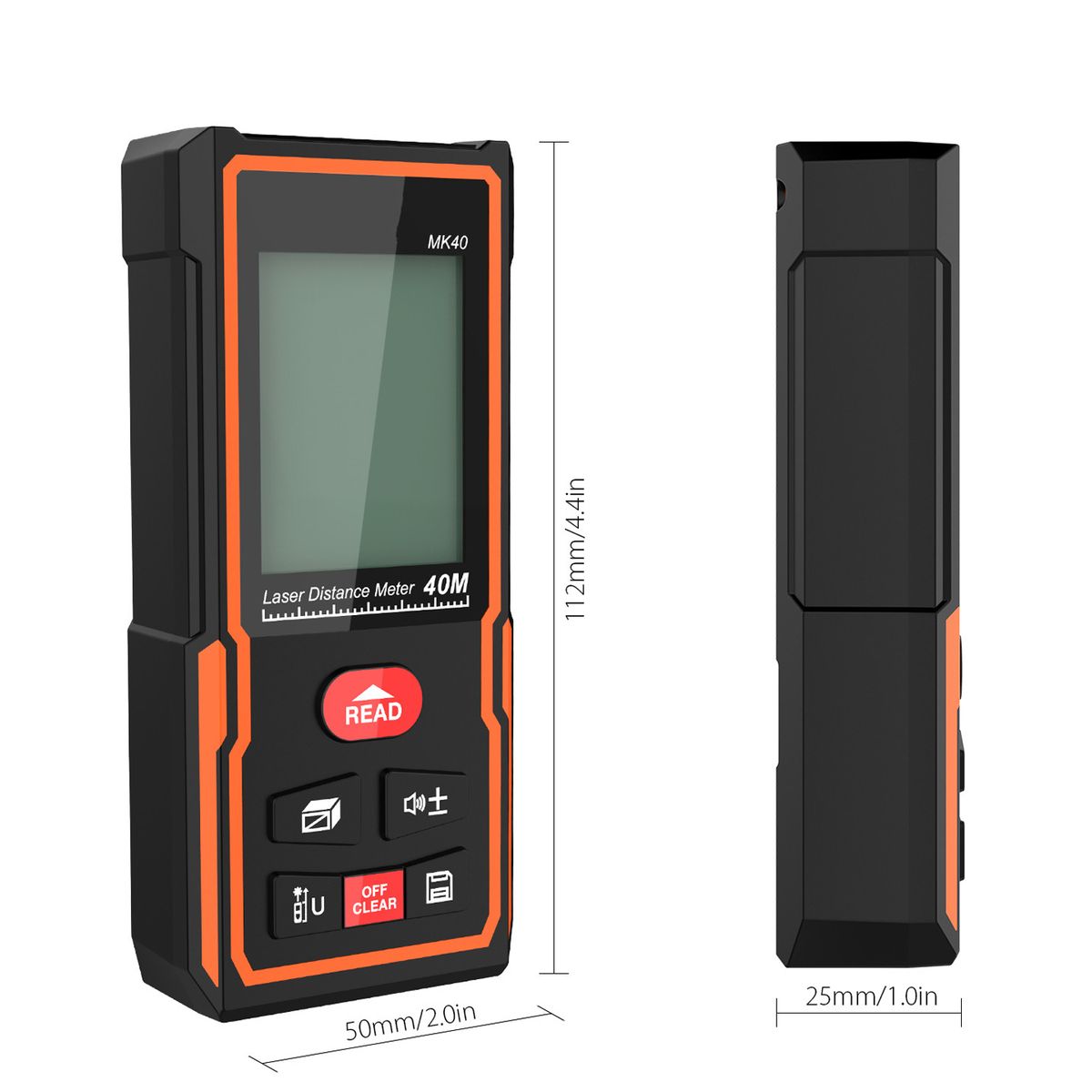 Quick measurement of distance, area and volume with one button operation. Easy targeting with bright laser pointer. Switchable units among meter (m), inch (in), feet (ft)(The MK40J only has m unit.)