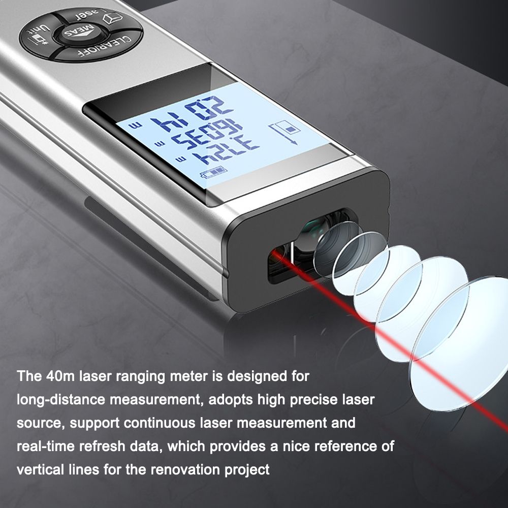 This digital laser rangefinder has various measurement functions including single/continuous measurement, area measurement, volumes measurement, and Pythagorean measurement. The 40m laser ranging meter is designed for long-distance measurement, adopts high precise laser source, support continuous laser measurement and real-time refresh data, which provides a nice reference of vertical lines for the renovation project. Wide applications, suitable for road engineering, housing engineering, construction engineering, water conservation engineering, electrical engineering, pipeline engineering, etc.