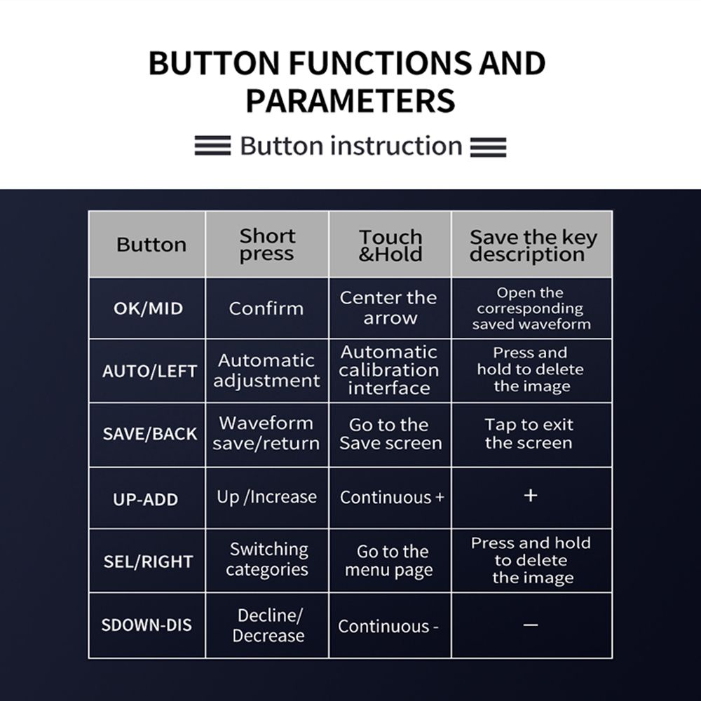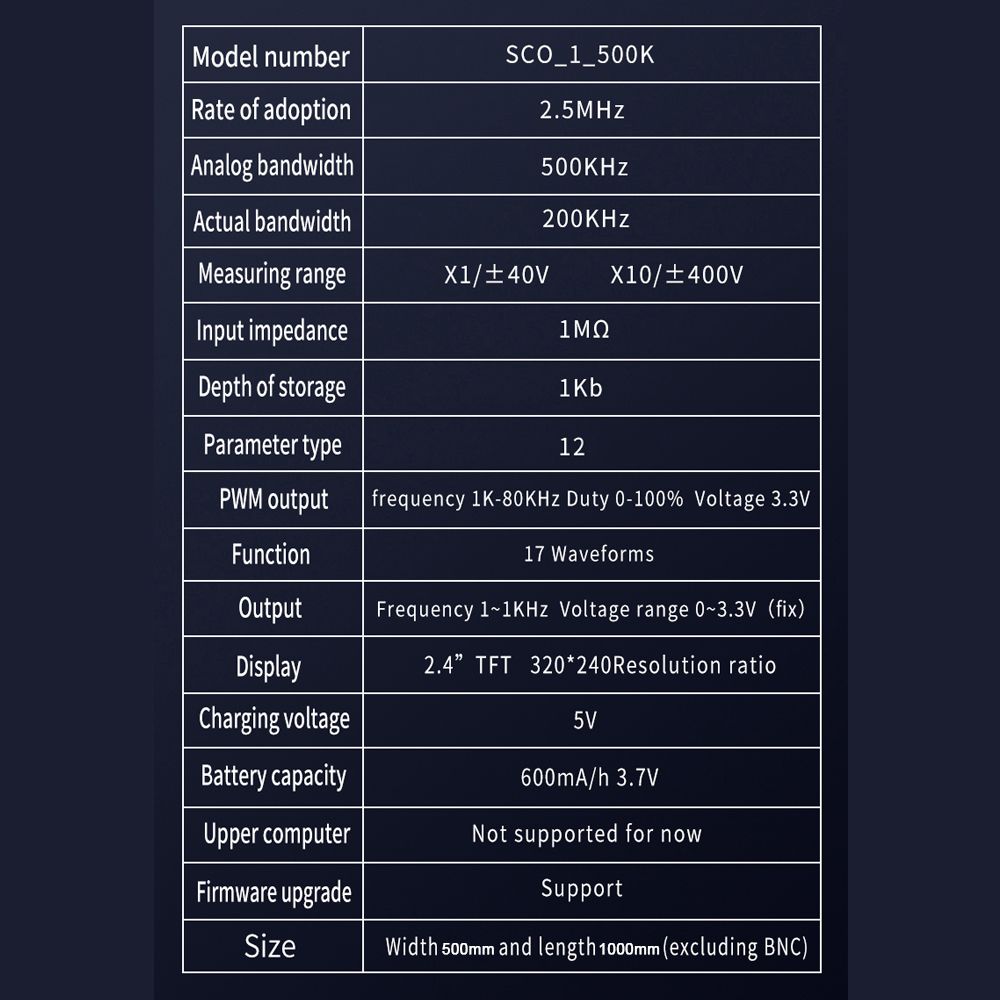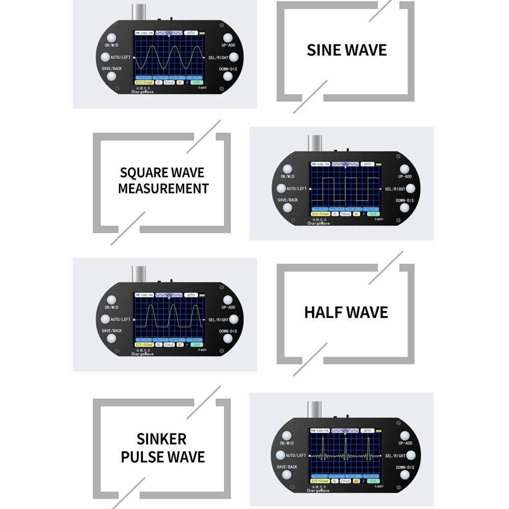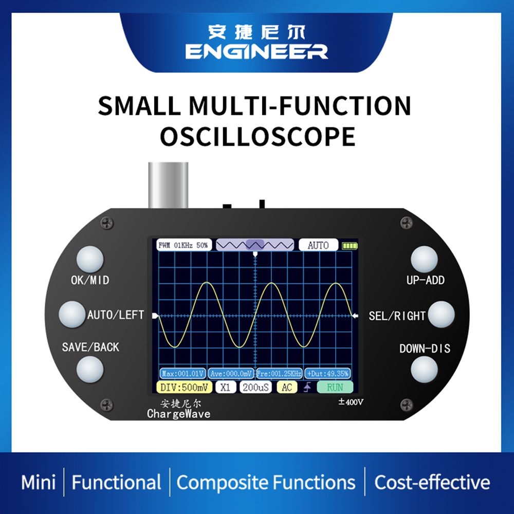 This oscilloscope has .4-inch TFT display, 320*240 resolution, you can see the measurement data displayed on the screen. 2.5MHz sample rate, 200KHz actual bandwidth, 500KHz analogue bandwidth (sinewaves). The efficient one-click AUTO function displays the measured waveform without tedious adjustment. Waveform measurements display functions that can be used to detect sinewaves, square waves, half-waves, sink pulse waves, etc.