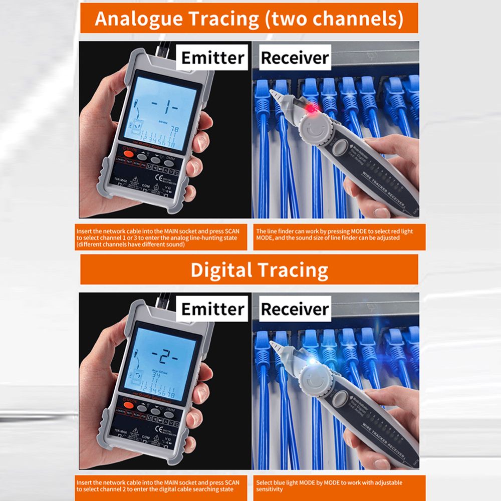 Multifunctional Cable Tester: This cable tester has the function of analogue tracing, cable mapping, PoE voltage measuring, digital tracing sensitivity adjustable, etc.