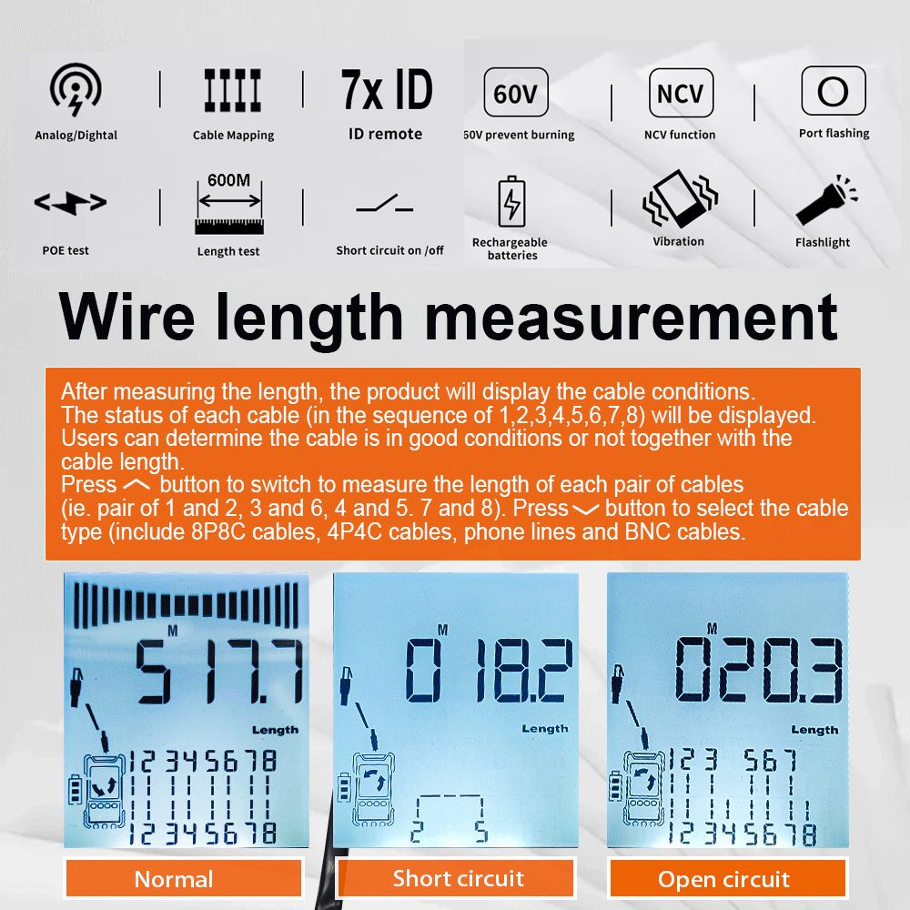 Cable Length Test: This function can apply to different metal cables with at least 2 cores including network cables, telephone lines and BNC cables. With the network cable length measuring ranges of 600M.