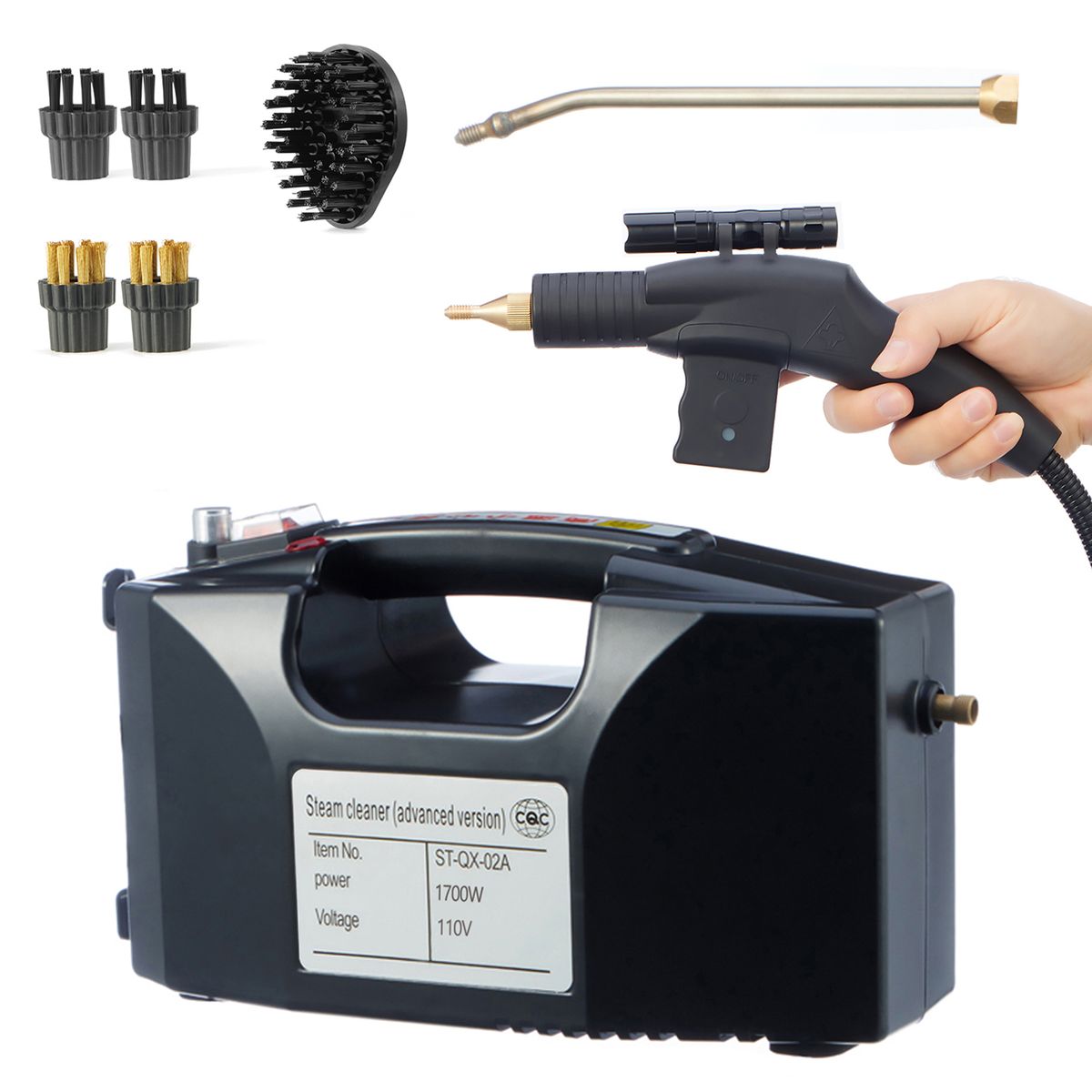 With 1.2m long water pipe and 3.5m long steam pipe for flexible use; with rich accessories which contain an extension rod and 5 cleaning brushes for easy replacement.