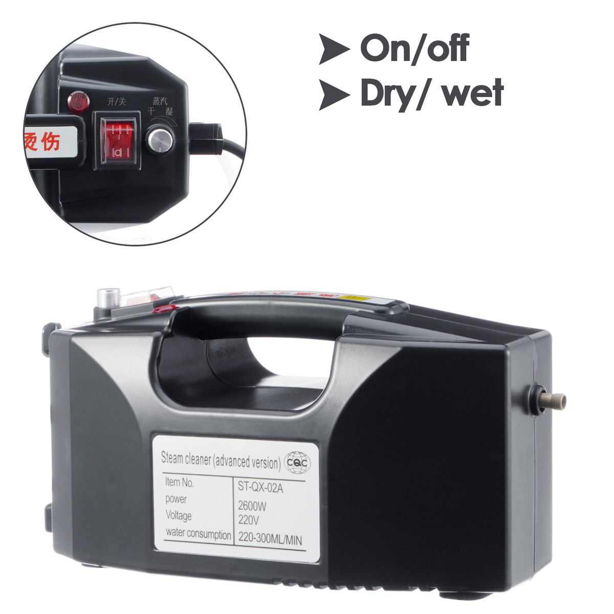 4 steps for easy use: prepare a water kettle and put the water inlet pipe into it; plug in; turn on the machine and rotate the knob to control water flow (adjust the humidity of the steam); one key start cleaning.
