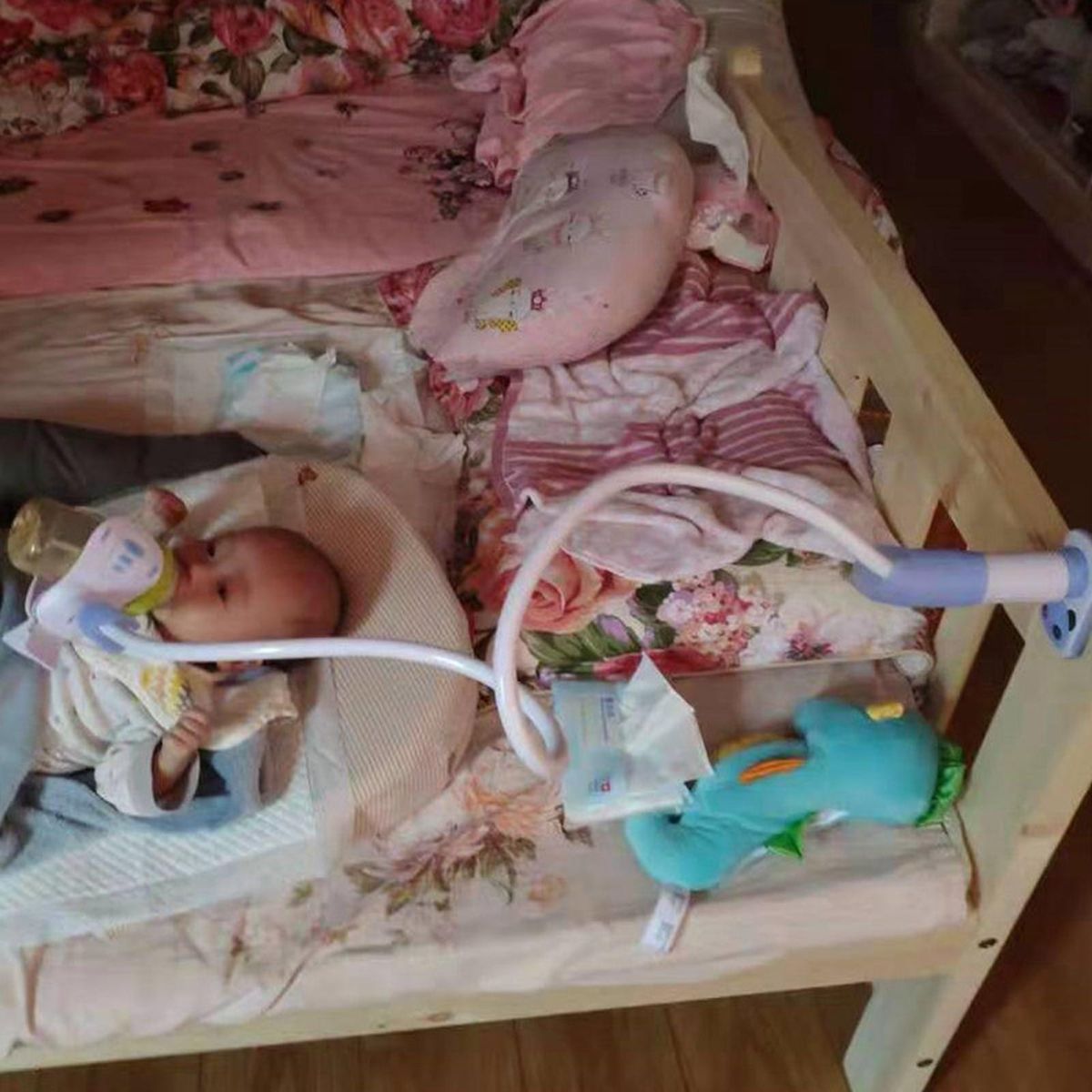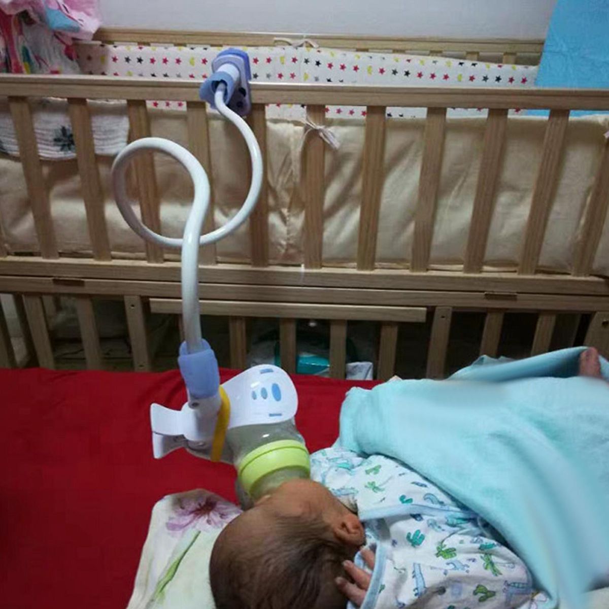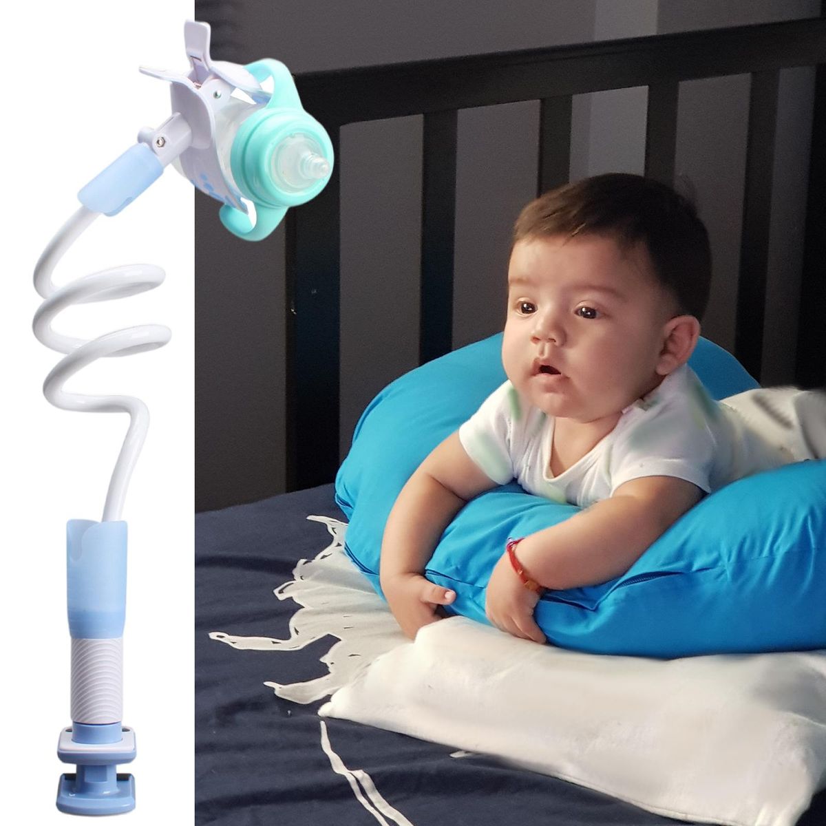 MATERIAL: Baby Bottle Rack is made of ABS+silicone+aluminum alloy material, which is firm and stable and can be used for a long time.SIZE: Length: 95cm, the diameter of the bottle that can be clamped is within 11cm, and the base is suitable for flat surfaces within 7cm.360° ROTATION: The bracket can be rotated 360°, and the soft tubes can be adjusted freely according to needs, which is flexible and convenient.BABY BOTTLE HOLDER: Non slip silicone grip design, suitable for most bottles, holding stable and not easy to fall.CONVENIENCE: Clip the bottle on the Fixed Bracket, let the baby feed by himself, and relax the hands, which is very convenient for the mother.