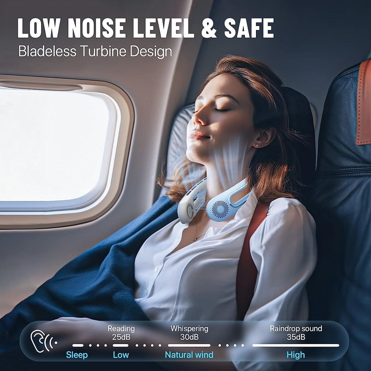 【Designed for Comfort & Safety】The bladeless neck fan weighs only 9 oz and features a 3 large hole design on the device to put less strain on the neck, delivering unmatched comfort and cool breeze. Made of skin-friendly ABS material, the air pinch-proof design adds extra comfort and ensures the user's safety for long-haired people, kids and the elderly. The cooling neck fan is designed to provide hands-free operation, keeping you cool while engaging in various activities.