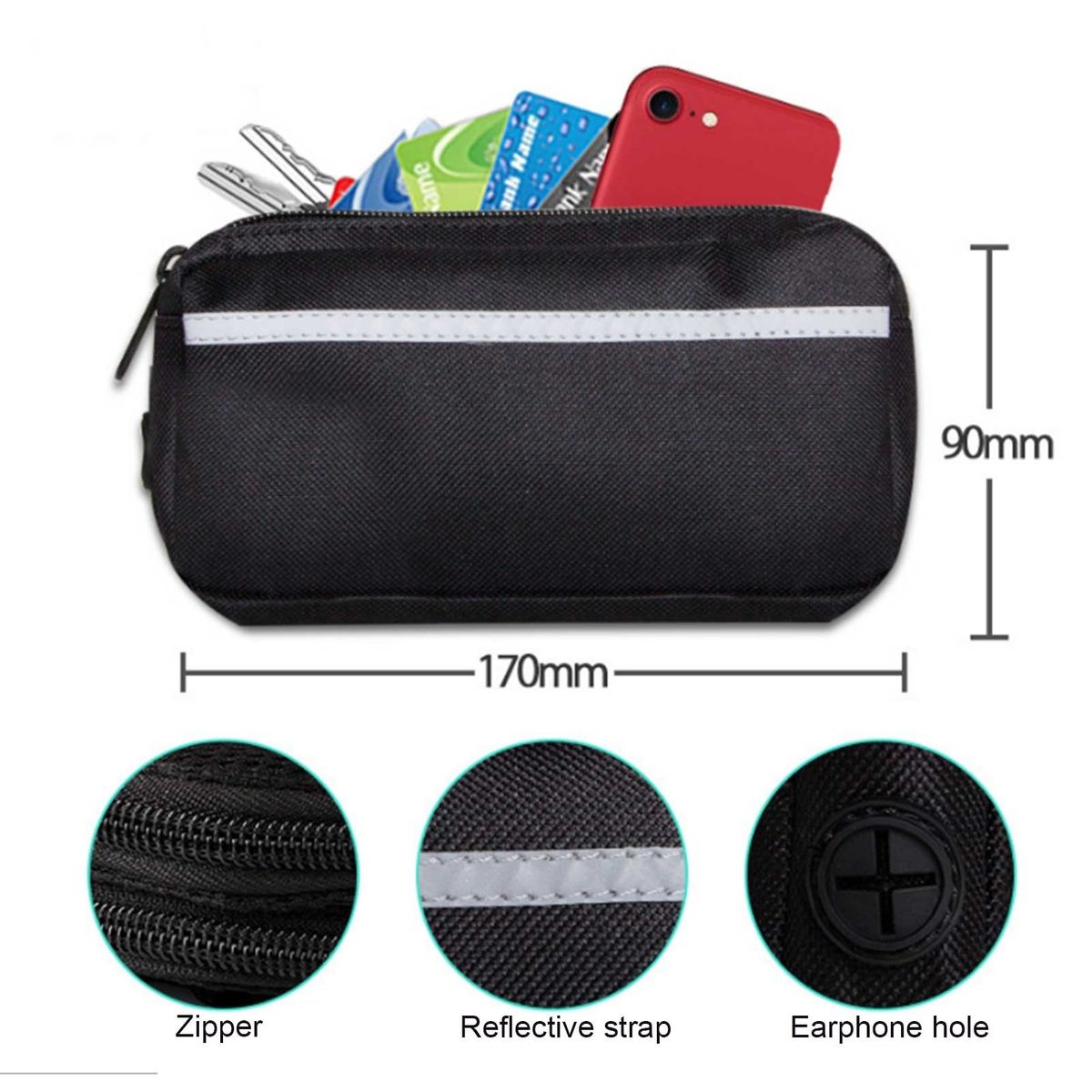 Removable zipper pouch can easily store and access your smartphone, keys, cards. With reflective strap for night safety and earphone hole design for convenience.