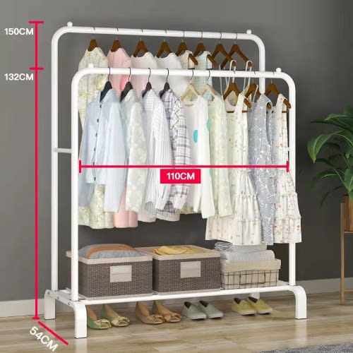 Double Poles:The clothes stand is with 2 hanging rails, one is 130cm height, another one is 155cm height, can meet the needs of different length clothes.With the bottom storage shelf, makes this clothing hanger more sturdy and provide more space for storage boxes, folded clothes, shoes or other things as you want.
