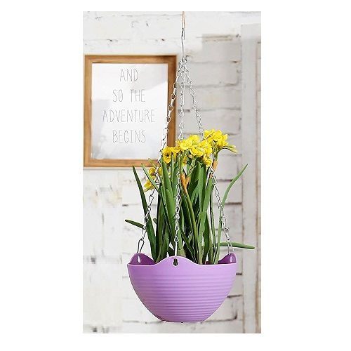 - self-watering plastic hanging planters with perforated insert and metal hanging chains. Each comes with a drainage plug for switching between indoor or outdoor use. An excellent choice for your lovely flowers and plants