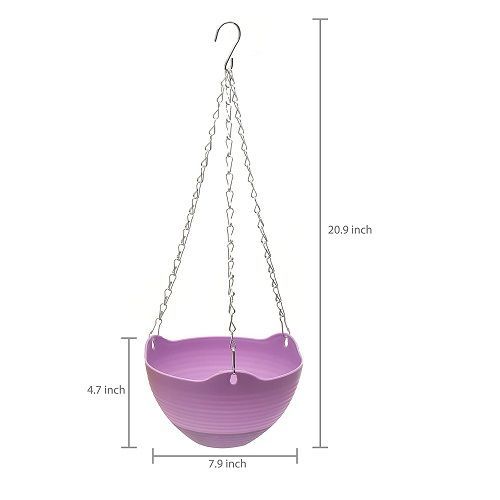 - Dimensions: The hanging planter is 8" dia. x 4.8" height (20.5cm x 12.3cm). Length of chain is 16.9 inch / 43cm. Total height is 20.9 inch / 53cm. The planters is made of premium quality plastic that is lightweight and resist damage from sun, rain and impacts