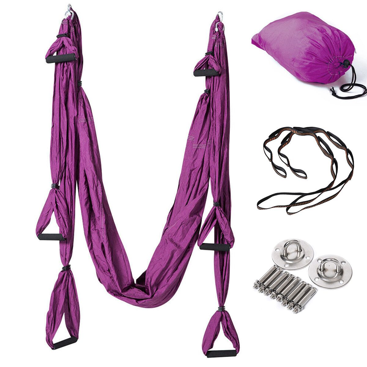 Feature:1. A long yoga swing hammock in the middle, 3 swing with 3 foam handles in both sides, and 4 independent hooks can be hung in the ceiling or wall.2. Anti-gravity yoga swing hammock, a good helper for you to do anti-gravity yoga exercises, decompression inversion, swing.3. Made of 210T fabric material, wear resistance, anti-tearing, intolerance dirty, and comfortable when exercise on it.4. Easy to carry and pack, can be folded into the carry bag.5. The load capacity is up to 200 kg (440lbs).6. Easy to be cleaned and dry quickly after wet.