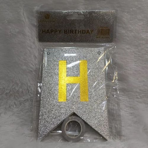 PACKAGE INSIDE 1pcs Happy Birthday Banner, gold with silver letters,each letter alphabet is about 4.5 x 6.5in,,the length of the banner is over 5 ft.