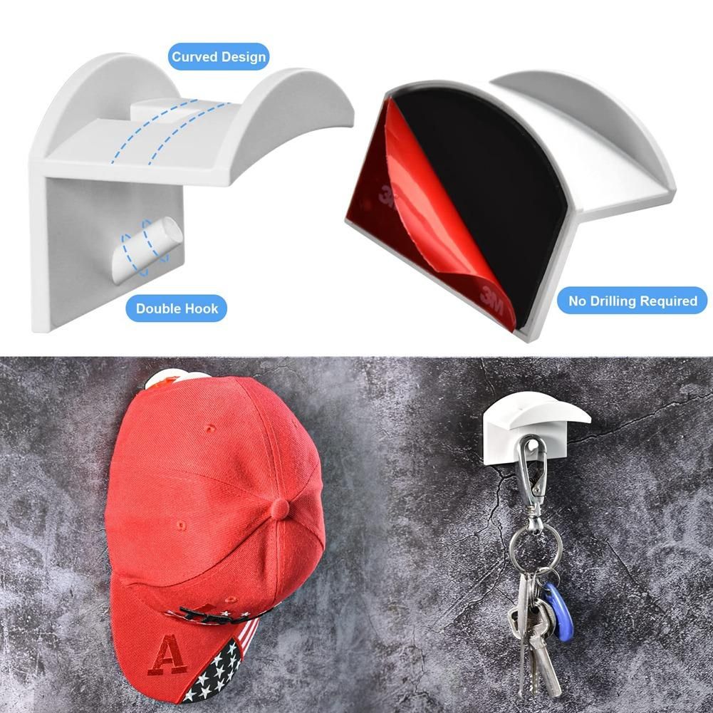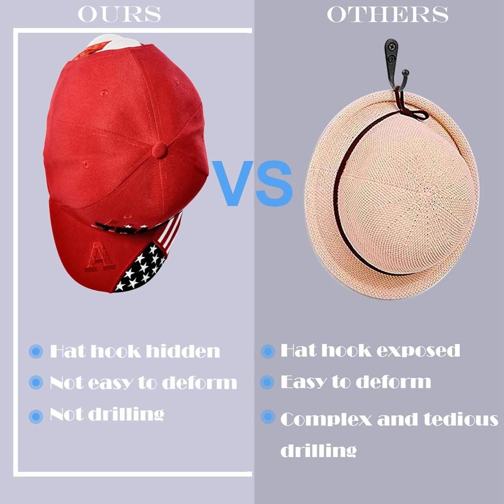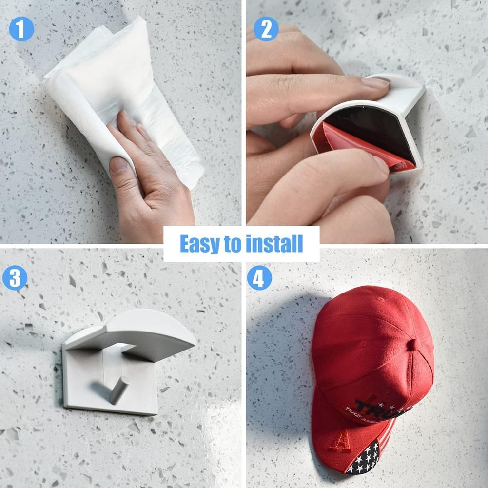 STRONG STICKINESS STICKERS: The back of the hat hanger is a strong adhesive, so that you can easy to install it without drilling. Just peel off back protection and press it on the smooth and clean surface, which won't damage the wall.