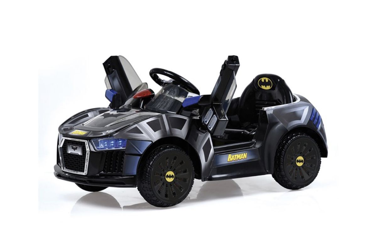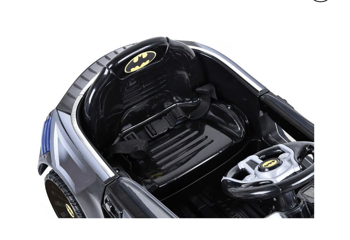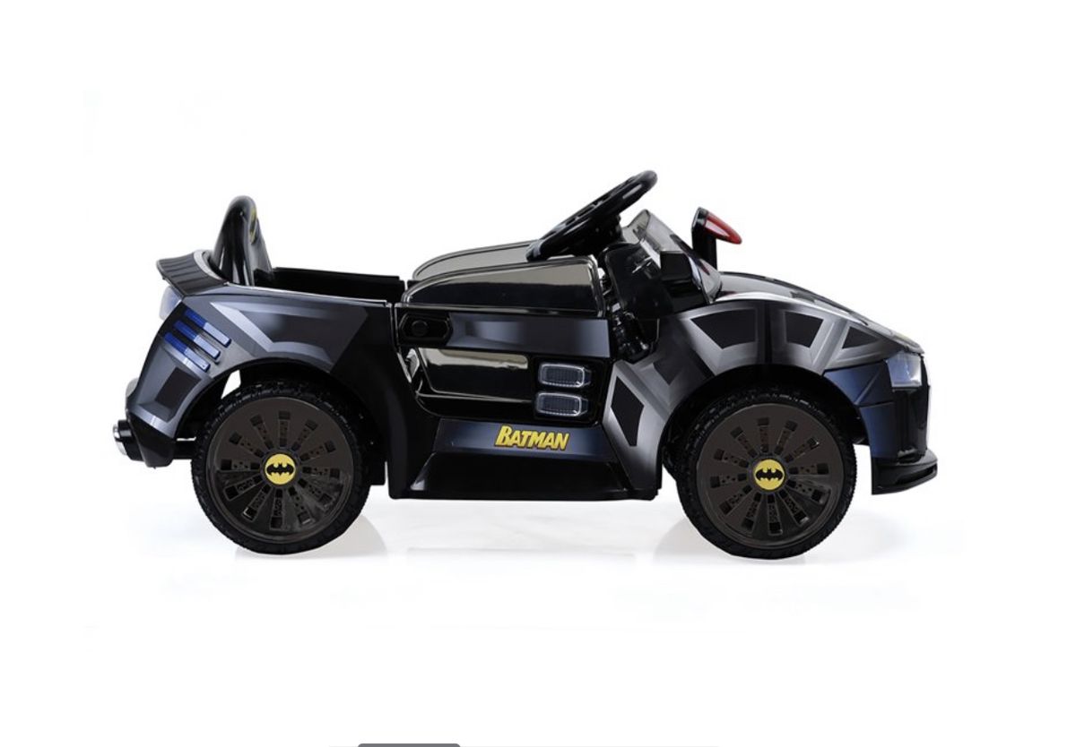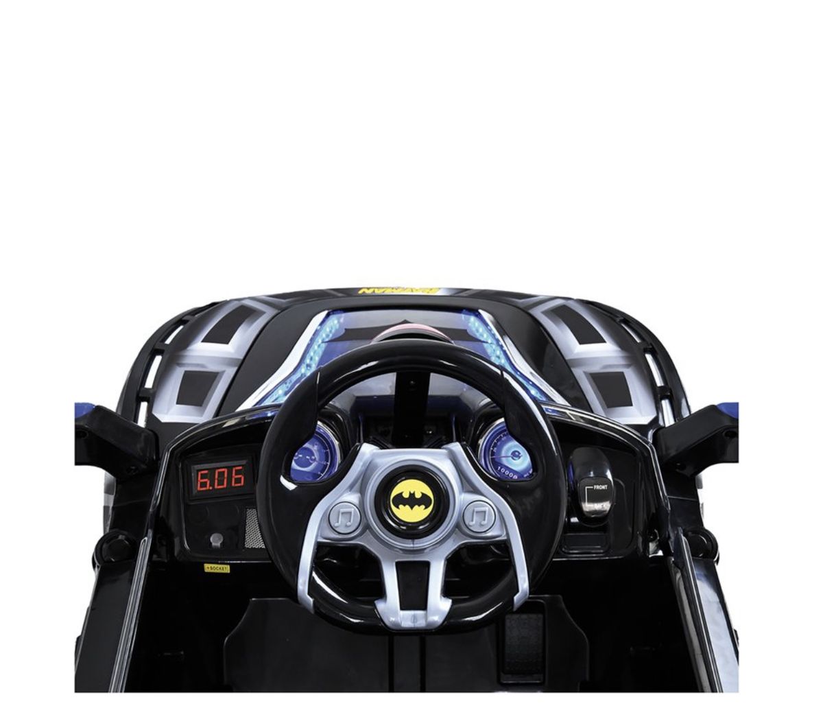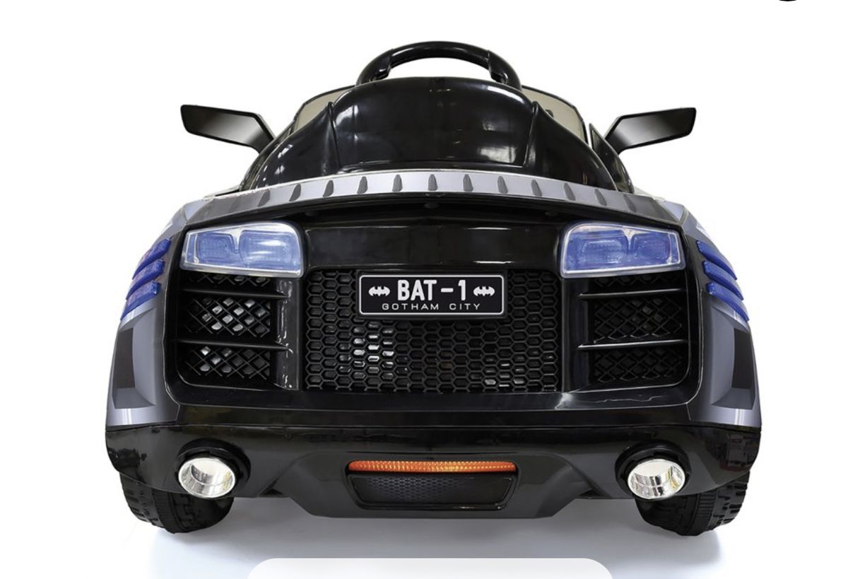 E-Batmobile, using electric power to make Gotham Streets safe! Hauck's E-Batmobile accelerates up to 2.5 mph / 4km, drivetrain forward and reverse, electronic sound effects, led lights and 6 Volt rechargable battery. Perfect addition for crime fighters between the ages 4 to 8 years old everywhere!! Assembled Product Dimensions: 39" x 21" x 18".