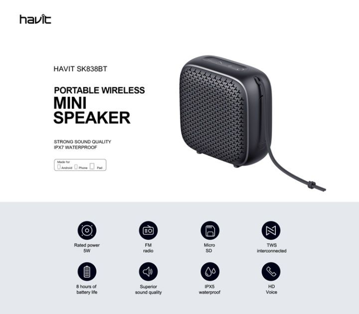 HAVIT Cabinet Material: Metal Display Screen: Yes Support APP: Yes Communication: AUX,Bluetooth Battery: Yes Voice Control: No Support Apt-x: Yes Model Number: HV-M28 PMPO: 10W Power Source: Battery Speaker Type: Portable Support Memory Card: Yes Display Screen: Yes Playback Function: Other Output Power: 10W Built-in Microphone: Yes Intelligent Personal Assistant: None Waterproof: No Number of Loudspeaker Enclosure: 1 Channels: 2 (2.0) Remote Control: No Feature: None Audio Crossover: Full-Range Material: Aluminum Wi-Fi Music: None Packaging Details; Unit Type: piece Package Weight: 0.6kg (1.32lb.) Package Size: 22cm x 5cm x 55cm (8.66in x 1.97in x 21.65in)M28 Bluetooth Speaker Alarm Clock with FM Radio & Built-in MicPerfect sound quality