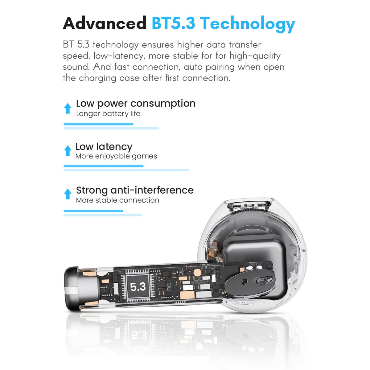 ▶ Effortless to Pair: BT 5.3 technology ensures higher data transfer speed, low-latency, more stable for high-quality sound. And fast connection, auto pairing when open the charging case after first connection.
