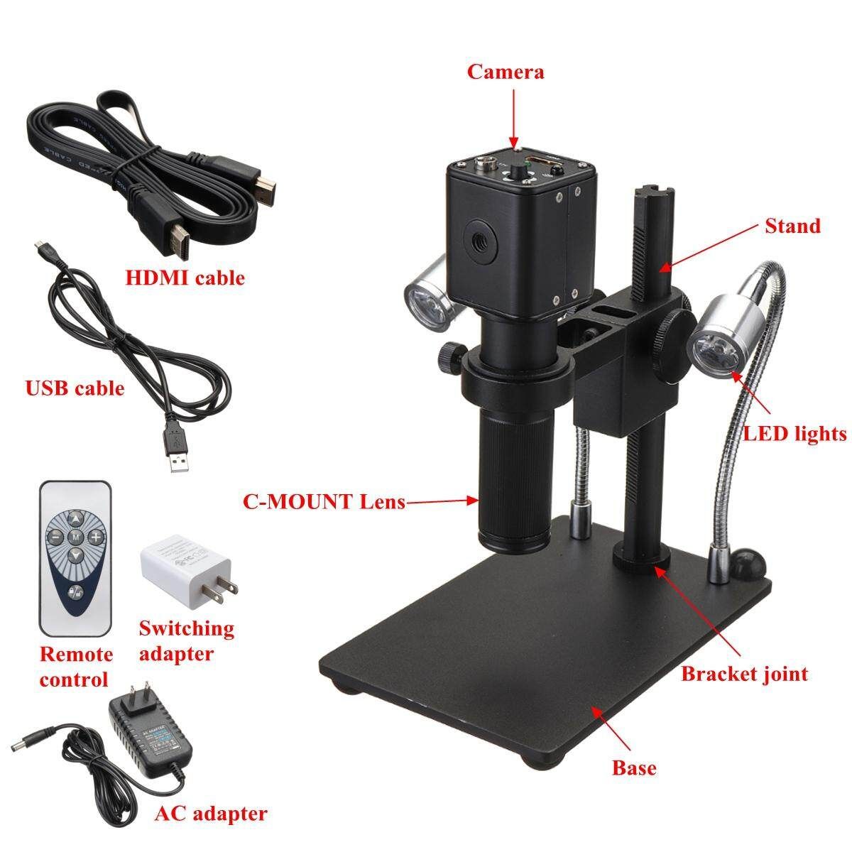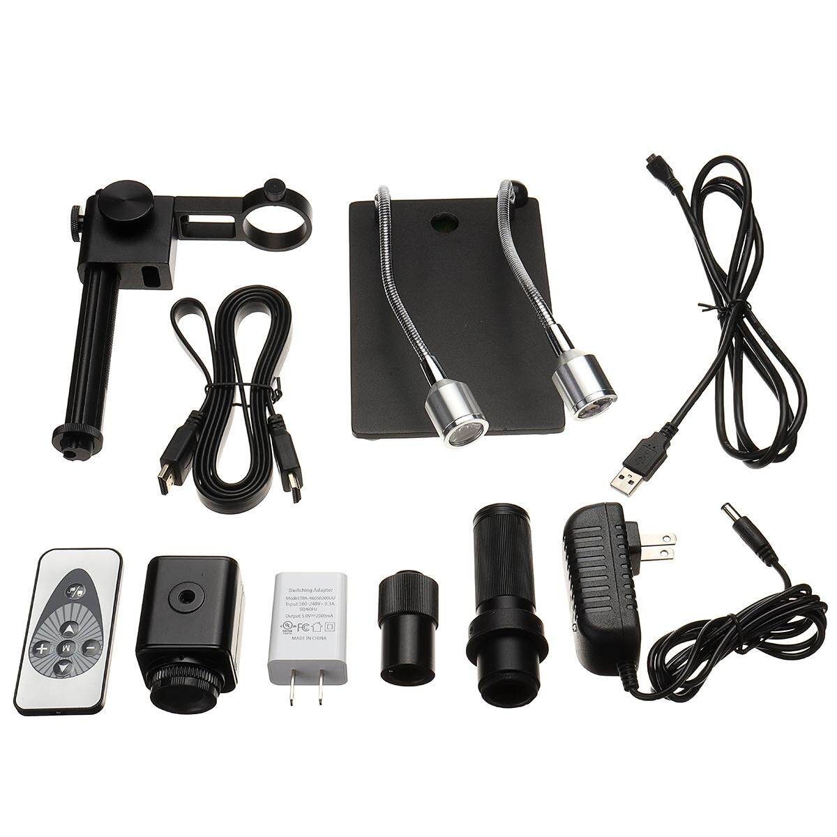1 x 2.0MP Digital Industrial Camera 1 x Electronic magnifier 1 x AC adapter 1 x Switching adapter 1 x Remote control 1 x USB cable 1 x High Definition Multimedia Interface cable 1 x Bracket joint 1 x Base (with 2 LED lights) 1 x Stand